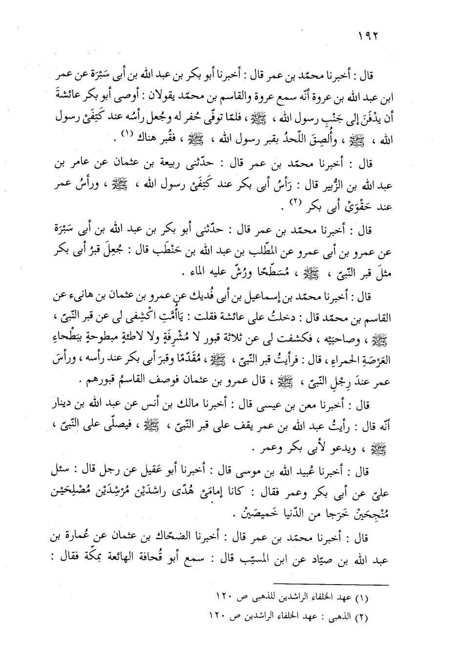 قال: أخبرنا محمّد بن إسماعيل بن أبي فُديك عن عمرو بن عثمان بن هانئ عن القاسم بن محمّد قال: دخلتُ على عائشة فقلت: يَا أُمَّتِ اكْشِفى لي عن قبر النّبيّ، - صلى الله عليه وسلم -، وصاحبَيْه، فكشفت لي عن ثلاثة قبور لا مُشْرِفَةٍ ولا لاطئةٍ مبطوحةٍ ببَطْحاءِ العَرْصَةِ الحمراءِ، قال: فرأيتُ قبر النّبيّ، - صلى الله عليه وسلم -، مُقَدّمًا وقبرَ أبى بكر عند رأسه، ورأسَ عمر عندَ رِجْلِ النّبيّ، - صلى الله عليه وسلم -، قال عمرو بن عثمان فوصف القاسمُ قبورهم.
