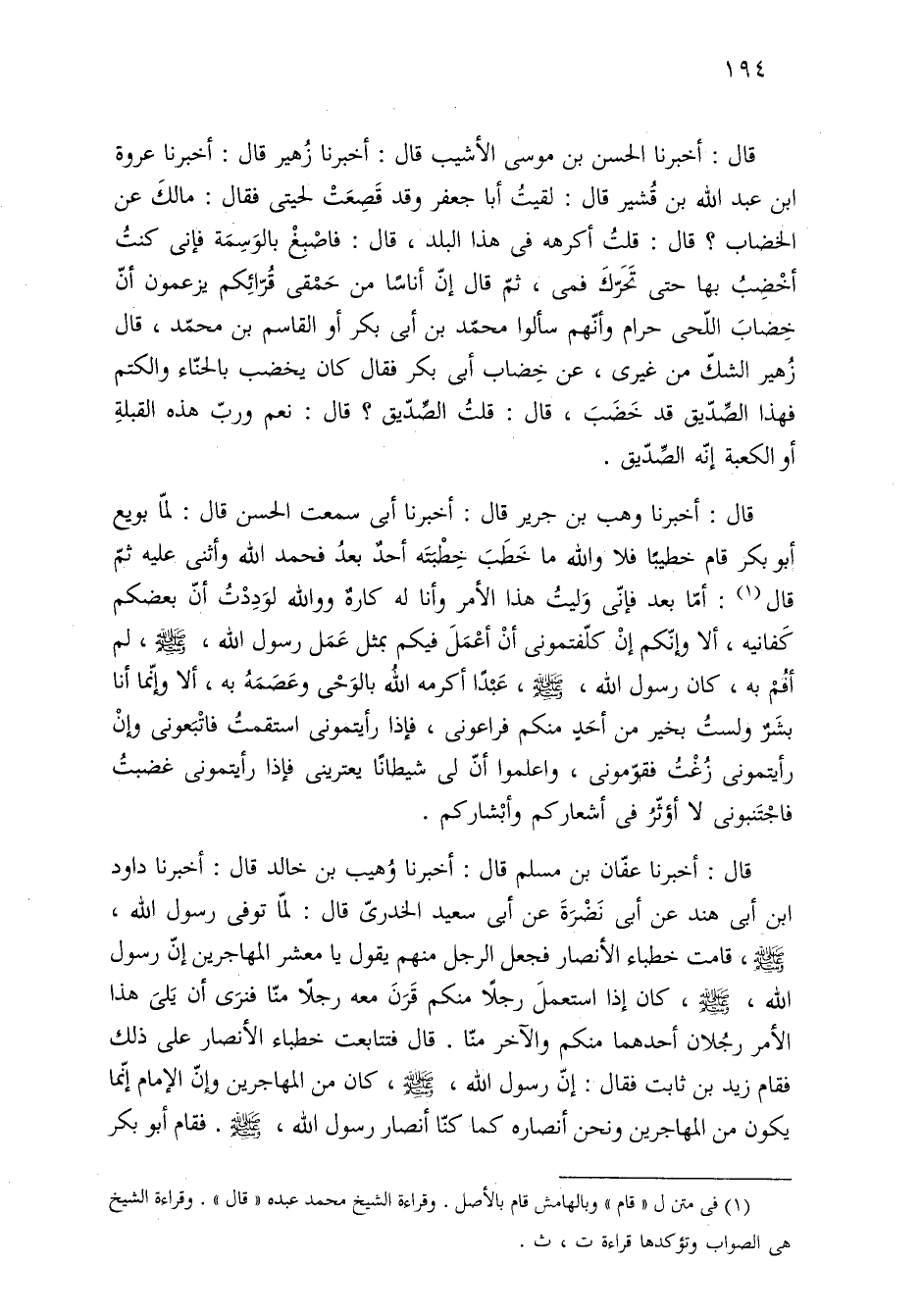 قال: أخبرنا عفّان بن مسلم قال: أخبرنا وُهيب بن خالد قال: أخبرنا داود بن أبي هند عن أبي نَضْرَهً عن أبي سعيد الخدريّ قال: لمّا توفى رسول الله، - صلى الله عليه وسلم -، قامت خطباء الأنصار فجعل الرجل منهم يقول يا معشر المهاجرين إنّ رسول الله، - صلى الله عليه وسلم -، كان إذا استعملَ رجلًا منكم قَرَنَ معه رجلًا منّا فنرَى أن يَلىَ هذا الأمر رجُلان أحدهما منكم والآخر منّا. قال فتتابعت خطباء الأنصار على ذلك فقام زيد بن ثابت فقال: إنّ رسول الله، - صلى الله عليه وسلم -، كان من المهاجرين وإنّ الإمام إنّما يكون من المهاجرين ونحن أنصاره كما كنّا أنصار رسول الله، - صلى الله عليه وسلم -. فقام أبو بكر