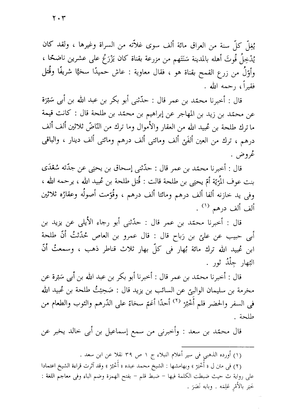 قال: أخبرنا محمّد بن عمر قال: حدّثني أبو رجاء الأيلى عن يزيد بن أبى حبيب عن عليّ بن رَباح قال: قال عمرو بن العاص حُدّثتُ أنّ طلحة بن عُبيد الله ترك مائة بُهار في كلّ بهار ثلاث قناطر ذهب، وسمعتُ أنّ البُهار جِلْدُ ثور.