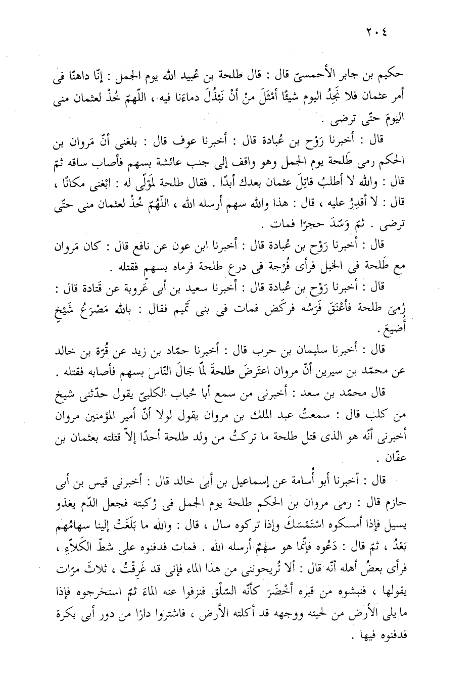 قال: أخبرنا رَوْح بن عُبادة قال: أخبرنا عوف قال: بلغنى أنّ مَروان بن الحكم رمى طَلحة يوم الجمل وهو واقف إلى جنب عائشة بسهم فأصاب ساقه ثمّ قال: والله لا أطلبُ قاتِلَ عثمان بعدك أبدًا. فقال طلحة لمَوْلًى له: ابْغنى مكانًا، قال: لا أقدِرُ عليه، قال: هذا والله سهم أرسله الله، اللهُمّ خُذْ لعثمان منى حتَّى ترضى. ثمّ وَسّدَ حجرًا فمات.