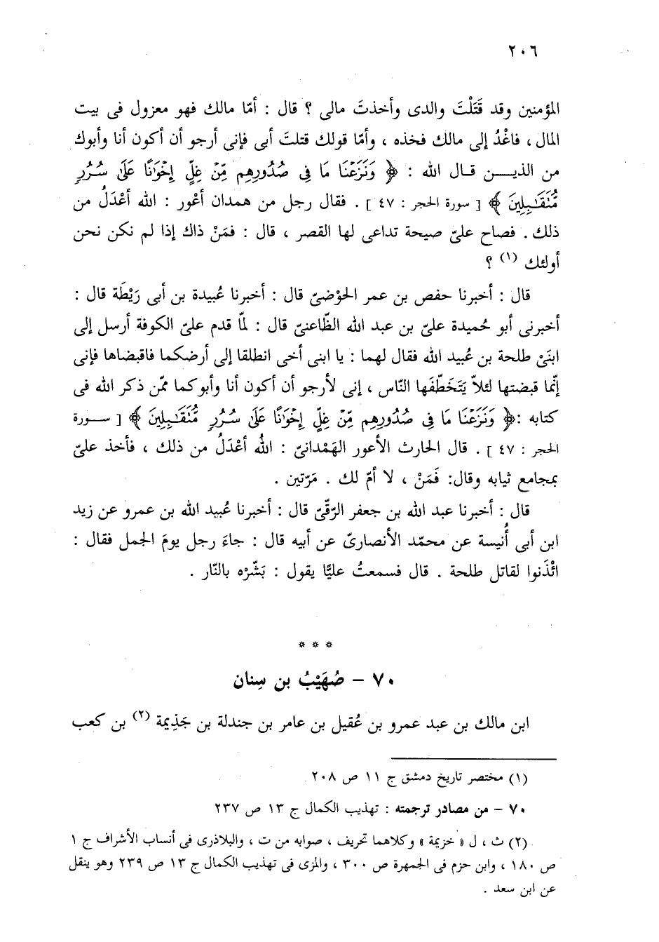 قال: أخبرنا حفص بن عمر الحوْضيّ قال: أخبرنا عُبيدة بن أبي رَيْطَة قال: أخبرني أبو حُميدة عليّ بن عبد الله الظّاعنيّ قال: لمّا قدم عليّ الكوفة أرسل إلى ابنَىْ طلحة بن عُبيد الله فقال لهما: يا ابنى أخى انطلقا إلى أرضكما فاقبضاها فإنى إنّما قبضتها لئلّا يَتَخَطّفَها النّاس، إنى لأرجو أن أكون أنا وأبوكما ممّن ذكر الله في كتابه: {وَنَزَعْنَا مَا فِي صُدُورِهِمْ مِنْ غِلٍّ إِخْوَانًا عَلَى سُرُرٍ مُتَقَابِلِينَ} [سورة الحجر: ٤٧]. قال الحارث الأعور الهَمْدانيّ: الله أعْدَلُ من ذلك، فأخذ عليّ بمجامع ثيابه وقال: فَمَنْ، لا أمّ لك. مَرّتين.