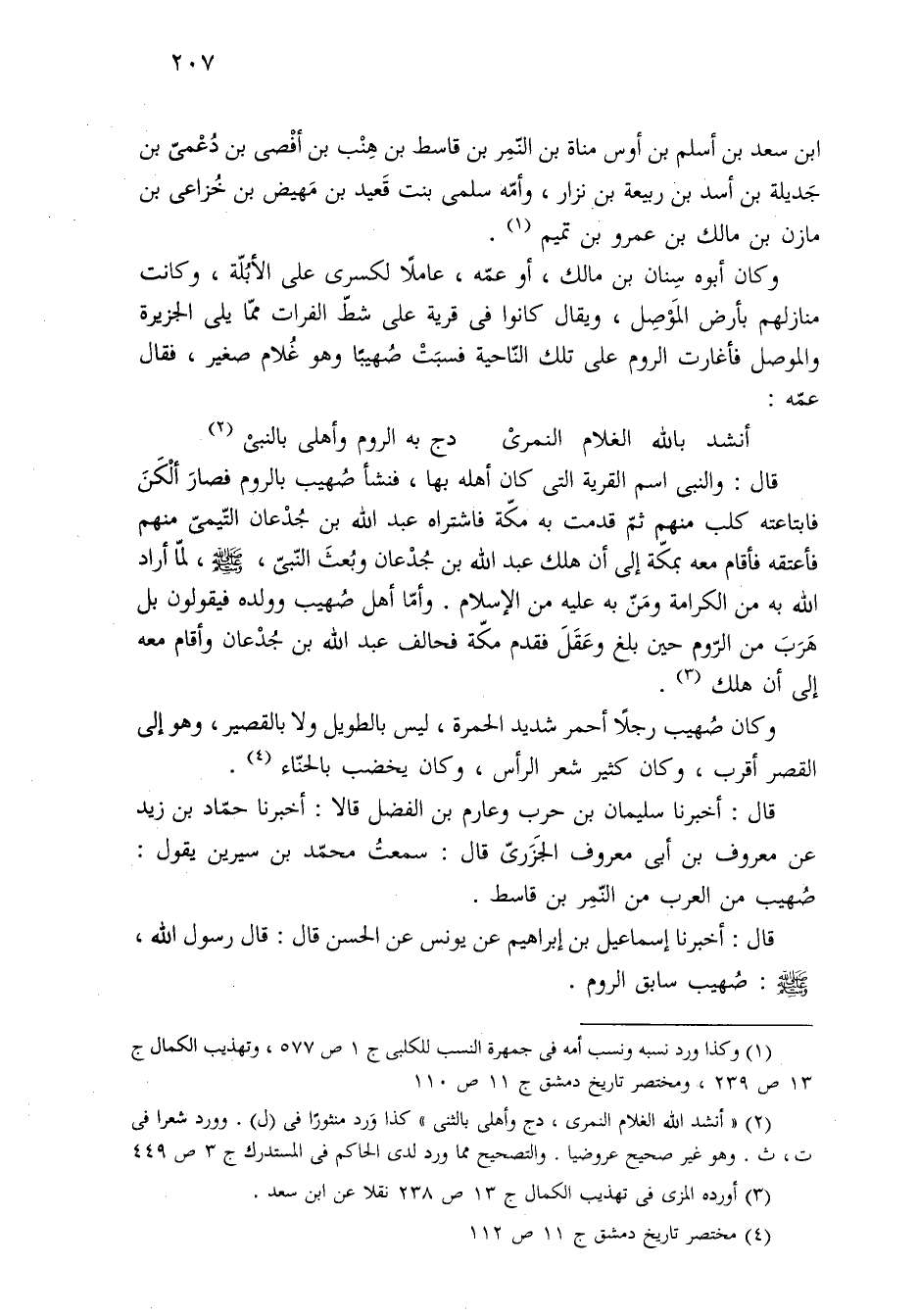 قال: أخبرنا سليمان بن حرب وعارم بن الفضل قالا: أخبرنا حمّاد بن زيد عن معروف بن أبي معروف الجَزَريّ قال: سمعتُ محمّد بن سيرين يقول: صُهيب من العرب من النّمِر بن قاسط.