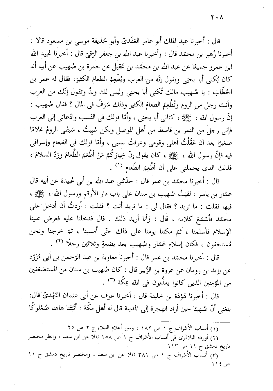 قال: أخبرنا عبد الملك أبو عامر العَقَديّ وأبو حُذيفة موسى بن مسعود قالا: أخبرنا زُهير بن محمّد قال: وأخبرنا عبد الله بن جعفر الرّقيّ قال: أخبرنا عُبيد الله بن عمرو جميعًا عن عبد الله بن محمّد بن عَقيل عن حمزة بن صُهيب عن أبيه أنه كان يُكنى أبا يحيَى ويقول إنّه من العرب ويُطْعِمُ الطعامَ الكثيرَ، فقال له عمر بن الخطّاب: يا صُهيب ما لك تُكنى أبا يحيَى وليس لك ولدٌ وتقول إنّك من العرب وأنت رجل من الروم وتُطْعِمُ الطعامَ الكثير وذلك سَرَفٌ في المال؟ فقال صُهيب: إنّ رسول الله، - صلى الله عليه وسلم -، كنانى أبا يحيَى، وأمّا قولك في النّسب وادّعائى إلى العرب فإنى رجل من النمر بن قاسط من أهل الموصل ولكن سُبِيتُ، سَبَتْنى الرومُ غلامًا صغيرًا بعد أن عَقَلْتُ أهلى وقومى وعرفتُ نسبى، وأمّا قولك في الطعام وإسرافى فيه فإنّ رسول الله، - صلى الله عليه وسلم -، كان يقول إنّ خِيارَكُمْ مَنْ أطْعَمَ الطَّعامَ ورَدّ السلامَ، فذلك الذي يحملنى على أن أطْعِمَ الطّعام (¬١).