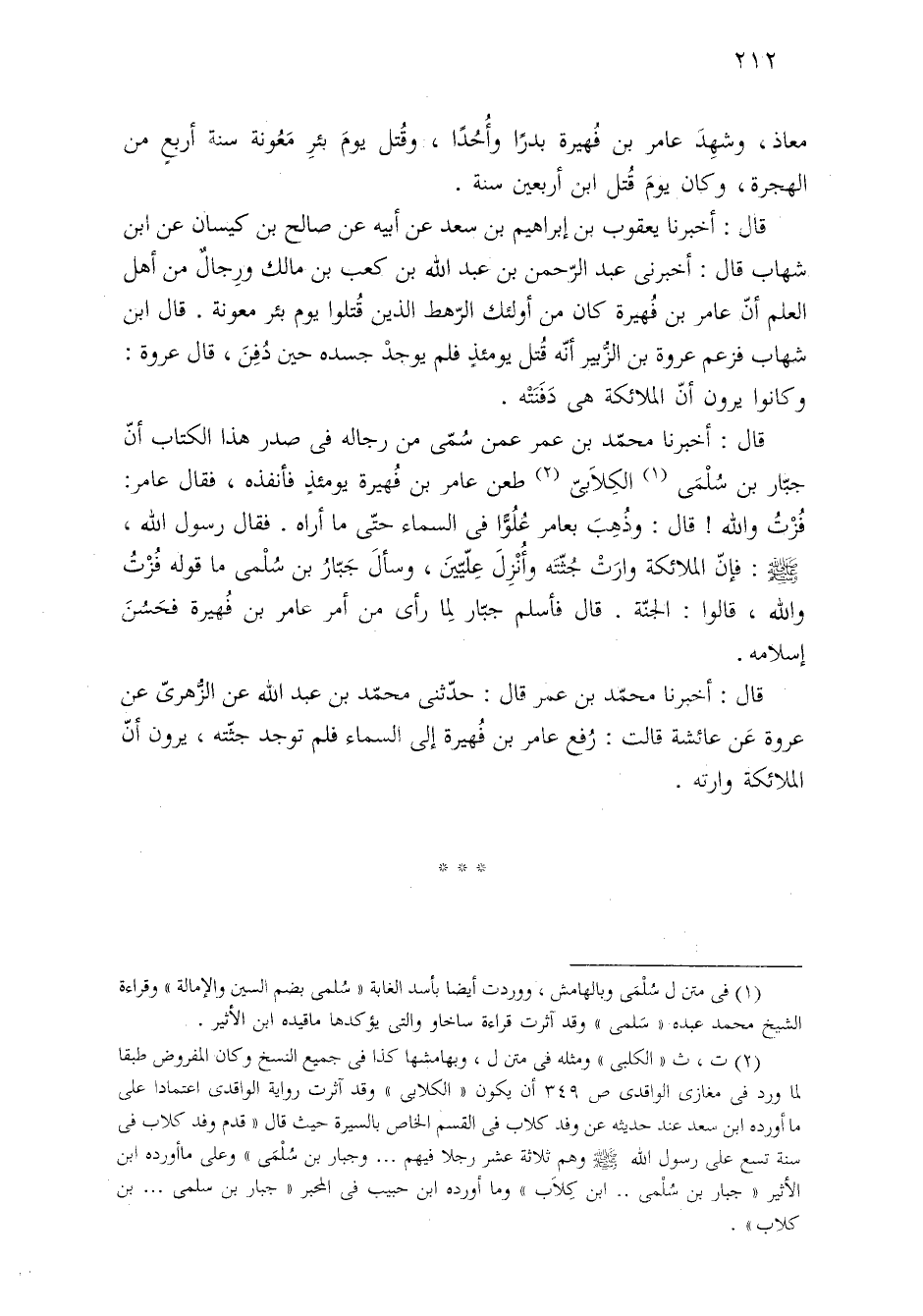قال: أخبرنا يعقوب بن إبراهيم بن سعد عن أبيه عن صالح بن كيسان عن ابن شهاب قال: أخبرني عبد الرّحمن بن عبد الله بن كعب بن مالك ورِجالٌ من أهل العلم أنّ عامر بن فُهيرة كان من أولئك الرّهط الذين قُتلوا يوم بئر معونة. قال ابن شهاب فزعم عروة بن الزُّبير أنّه قُتل يومئذٍ فلم يوجدْ جسده حين دُفِنَ، قال عروة: وكانوا يرون أنّ الملائكة هي دَفَنَتْه.