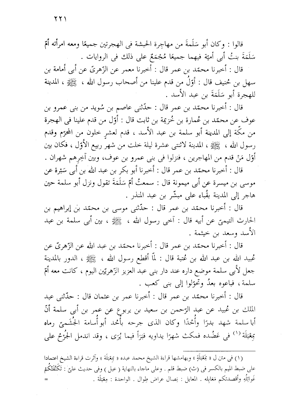 قال: أخبرنا محمّد بدق عمر قال: أخبرنا معمر عن الزّهريّ عن أبي أمامة بن سهل بن حُنيف قال: أوّل من قدم علينا من أصحاب رسول الله، - صلى الله عليه وسلم -، المدينة للهجرة أبو سَلَمَةَ بن عبد الأسد.