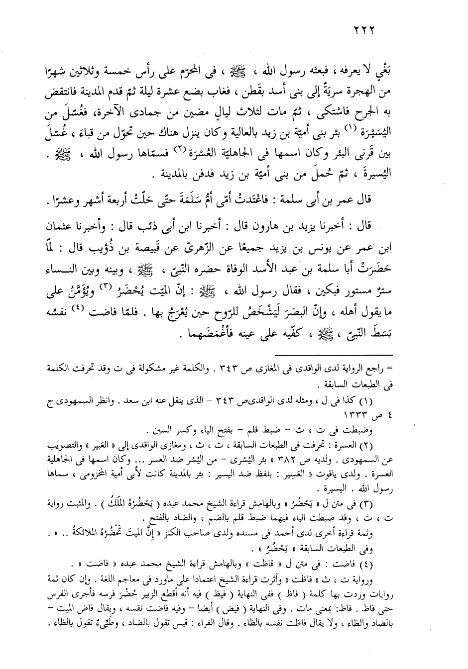= راجع الرواية لدى الواقدى في المغازي ص ٣٤٣. والكلمة غير مشكولة في ت وقد تحرفت الكلمة في الطبعات السابقة.