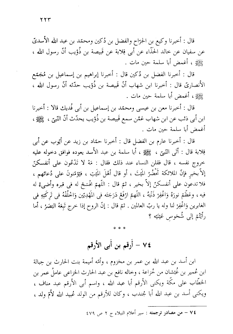 قال: أخبرنا وكيع بن الجرّاح والفضل بن دُكين ومحمّد بن عبد الله الأسديّ عن سفيان عن خالد الحَذّاء عن أبي قِلابة عن قَبيصة بن ذُؤيب أنّ رسول الله، - صلى الله عليه وسلم -، أغمض أبا سلمة حين مات.