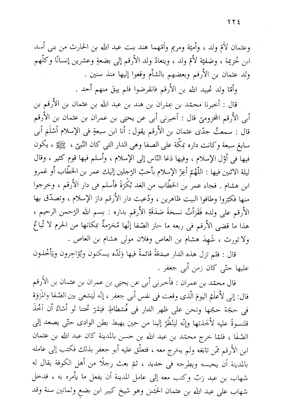قال: أخبرنا محمّد بن عِمْران بن هند بن عبد الله بن عثمان بن الأرقم بن أبى الأرقم المخزوميّ قال: أخبرني أبى عن يحيَى بن عمران بن عثمان بن الأرقم قال: سمعتُ جدّى عثمان بن الأرقم يقول: أنا ابن سبعةٍ في الإسلام أسْلَمَ أبى سابعَ سبعة وكانت داره بمكّة على الصفا وهي الدار التي كان النبيّ، - صلى الله عليه وسلم - , يكون فيها في أوّل الإسلام، وفيها دَعَا النّاس إلى الإسلام، وأسلم فيها قوم كثير، وقال ليلة الاثنين فيها: اللهُمّ أعِزّ الإسلام بأحبّ الرّجلين إليك عمر بن الخطّاب أو عَمرو بن هشام. فجاء عمر بن الخطّاب من الغد بُكْرَةً فأسلم في دار الأرقم، وخرجوا منها فكبّروا وطافوا البيت ظاهرين، ودُعيت دار الأرقم دارَ الإسلام، وتصدّق بها الأرقم على ولده فَقَرَأتُ نسخةَ صَدَقَةِ الأرقم بداره: بسم الله الرّحمن الرحيم، هذا ما قضى الأرقم في ربعه ما حاز الصّفا إنّها مُحَرّمةٌ بمكانها من الحرم لا تُباعُ ولا تورث، شَهِدَ هشام بن العاص وفلان مولى هشام بن العاص.