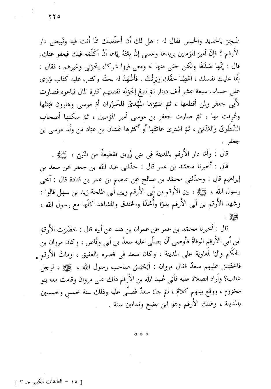 قال: أخبرنا محمّد بن عمر قال: حدّثني عبد الله بن جعفر عن سعد بن إبراهيم قال: وحدّثنى محمّد بن صالح عن عاصم بن عمر بن قتادة قال: آخى رسول الله، - صلى الله عليه وسلم -، بين الأرقم بن أبي الأرقم وبين أبى طلحة زيد بن سهل قالوا: وشهد الأرقم بن أبي الأرقم بدرًا وأُحُدًا والخندق والمشاهد كلّها مع رسول الله، - صلى الله عليه وسلم -.