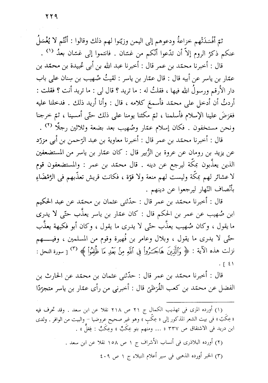قال: أخبرنا محمّد بن عمر قال: أخبرنا معاوية بن عبد الرّحمن بن أبي مزرّد عن يزيد بن رومان عن عروة بن الزُّبير قال: كان عمّار بن ياسر من المستضعفين الذين يعذَّبون بمكّة ليرجع عن دينه. قال محمّد بن عمر: والمستضعفون قوم لا عشائر لهم بمكّة وليست لهم منعة ولا قوّة، فكانت قريش تعذبهم في الرَّمْضَاءِ بأنْصاف النّهار ليرجعوا عن دينهم.
