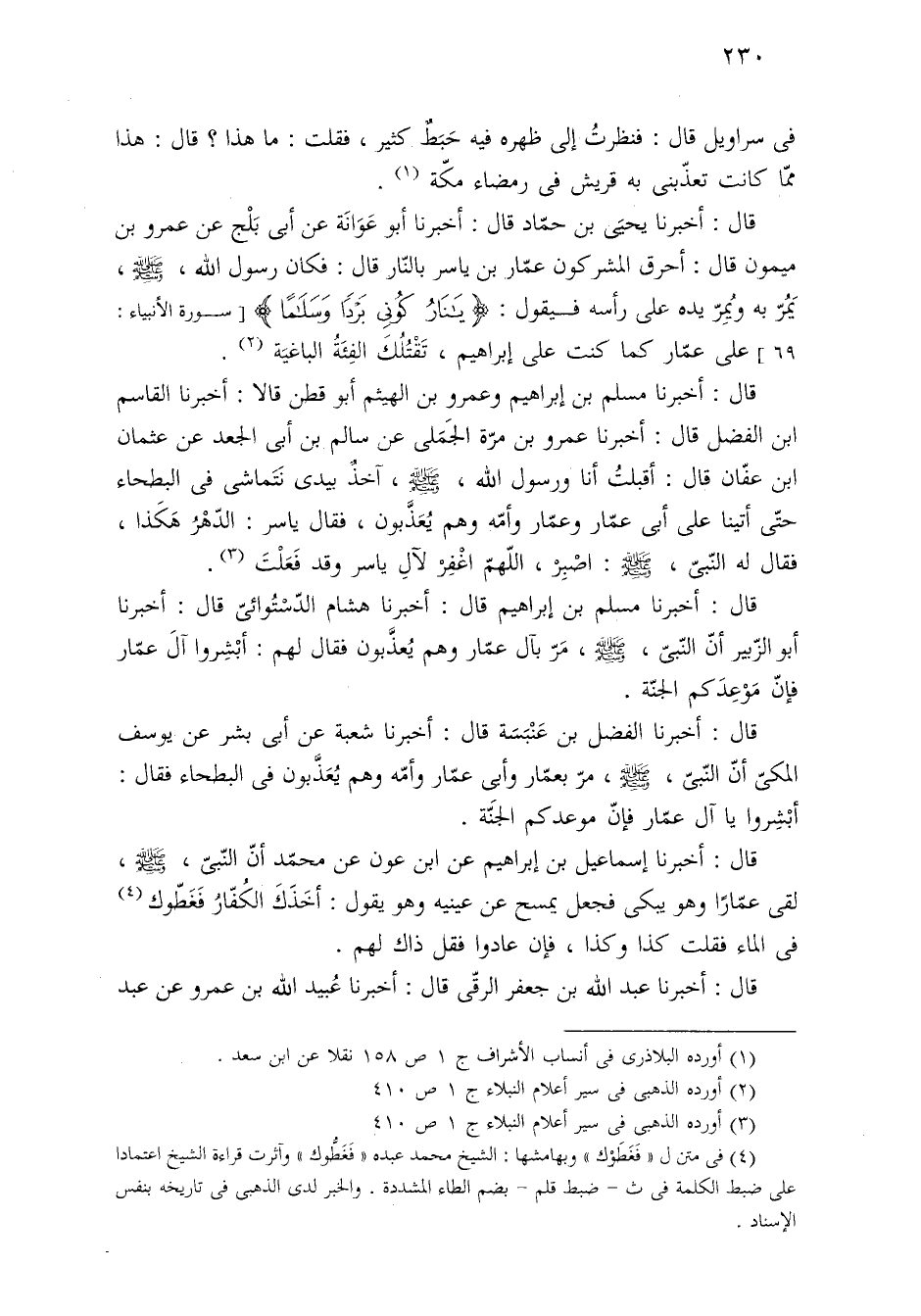 قال: أخبرنا مسلم بن إبراهيم وعمرو بن الهيثم أبو قطن قالا: أخبرنا القاسم بن الفضل قال: أخبرنا عمرو بن مرّة الجَمَلى عن سالم بن أبي الجعد عن عثمان بن عفّان قال: أقبلتُ أنا ورسول الله، - صلى الله عليه وسلم -، آخذٌ بيدى نَتَماشى في البطحاء حتَّى أتينا على أبى عمّار وعمّار وأمّه وهم يُعَذَّبون، فقال ساسر: الدّهْرُ هَكَذا، فقال له النّبيّ، - صلى الله عليه وسلم -: اصْبِرْ، اللهمّ اغْفِرْ لآلِ ياسر وقد فَعَلْتَ (¬٣).