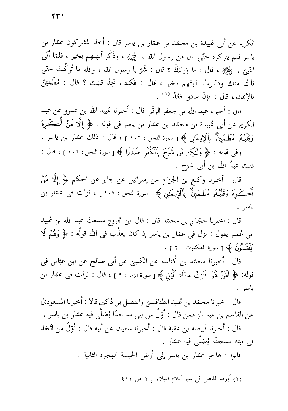 قال: أخبرنا عبد الله بن جعفر الرقّى قال: أخبرنا عُبيد الله بن عمرو عن عبد الكريم عن أبي عُبيدة بن محمّد بن عمّار بن ياسر في قوله: {إِلَّا مَنْ أُكْرِهَ وَقَلْبُهُ مُطْمَئِنٌّ بِالْإِيمَانِ} [سورة النحل: ١٠٦]، قال: ذلك عمّار بن ياسر.