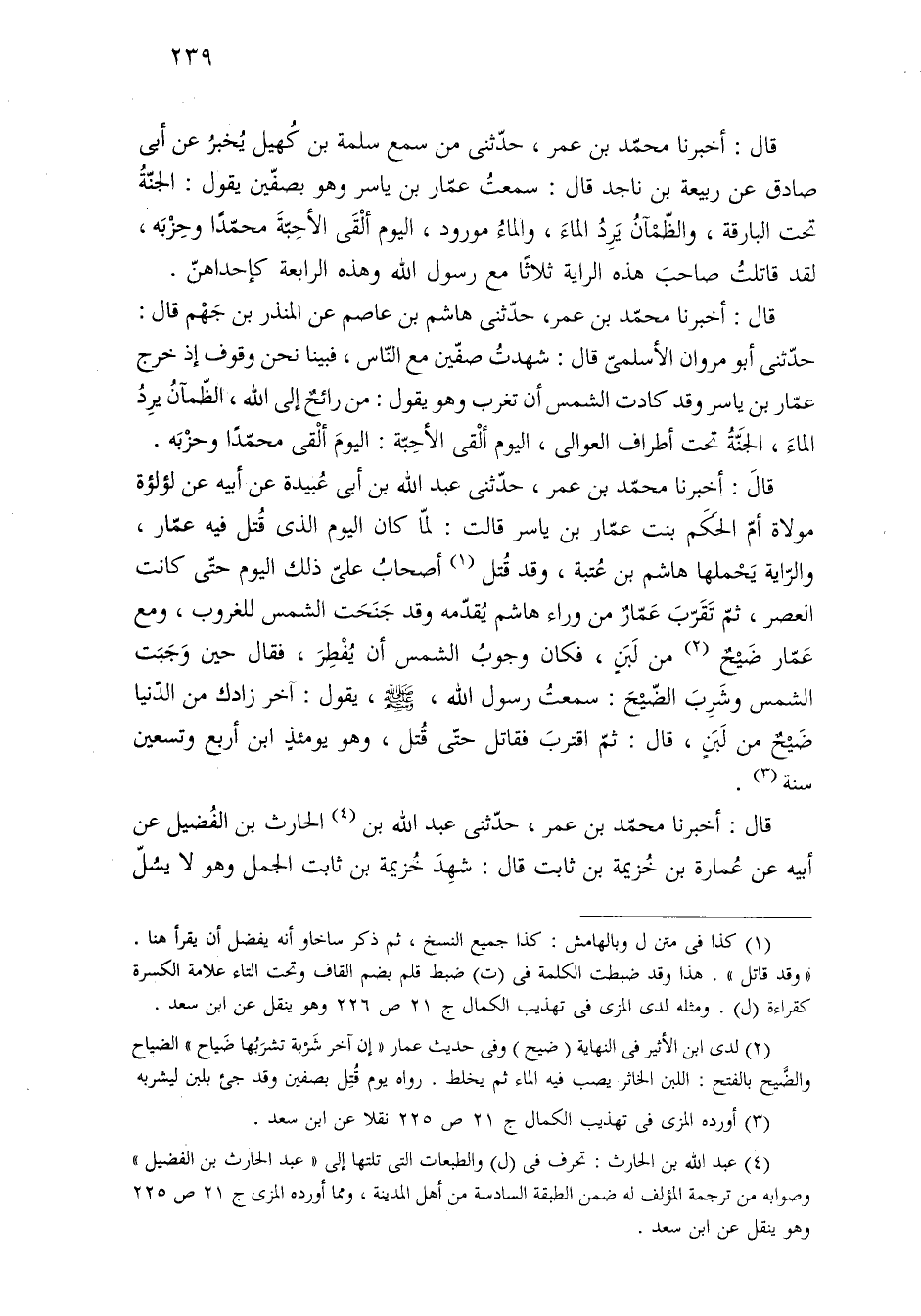 قالَ: أخبرنا محمّد بن عمر، حدّثني عبد الله بن أبي عُبيدة عن أبيه عن لؤلؤة مولاة أمّ الحَكَم بنت عمّار بن ياسر قالت: لمّا كان اليوم الذي قُتل فيه عمّار، والرّاية يَحْملها هاشم بن عُتبة، وقد قُتل (¬١) أصحابُ عليّ ذلك اليوم حتَّى كانت العصر، ثمّ تَقَرّبَ عَمّارٌ من وراء هاشم يُقدّمه وقد جَنَحَت الشمس للغروب، ومع عَمّار ضَيْحٌ (¬٢) من لَبَنٍ، فكان وجوبُ الشمس أن يُفْطِرَ، فقال حين وَجَبَت الشمس وشَرِبَ الضّيْحَ: سمعتُ رسول الله، - صلى الله عليه وسلم -، يقول: آخر زادك من الدّنيا ضَيْحٌ من لَبَنٍ، قال: ثمّ اقتربَ فقاتل حتَّى قُتل، وهو يومئذٍ ابن أربع وتسعين سنة (¬٣).
