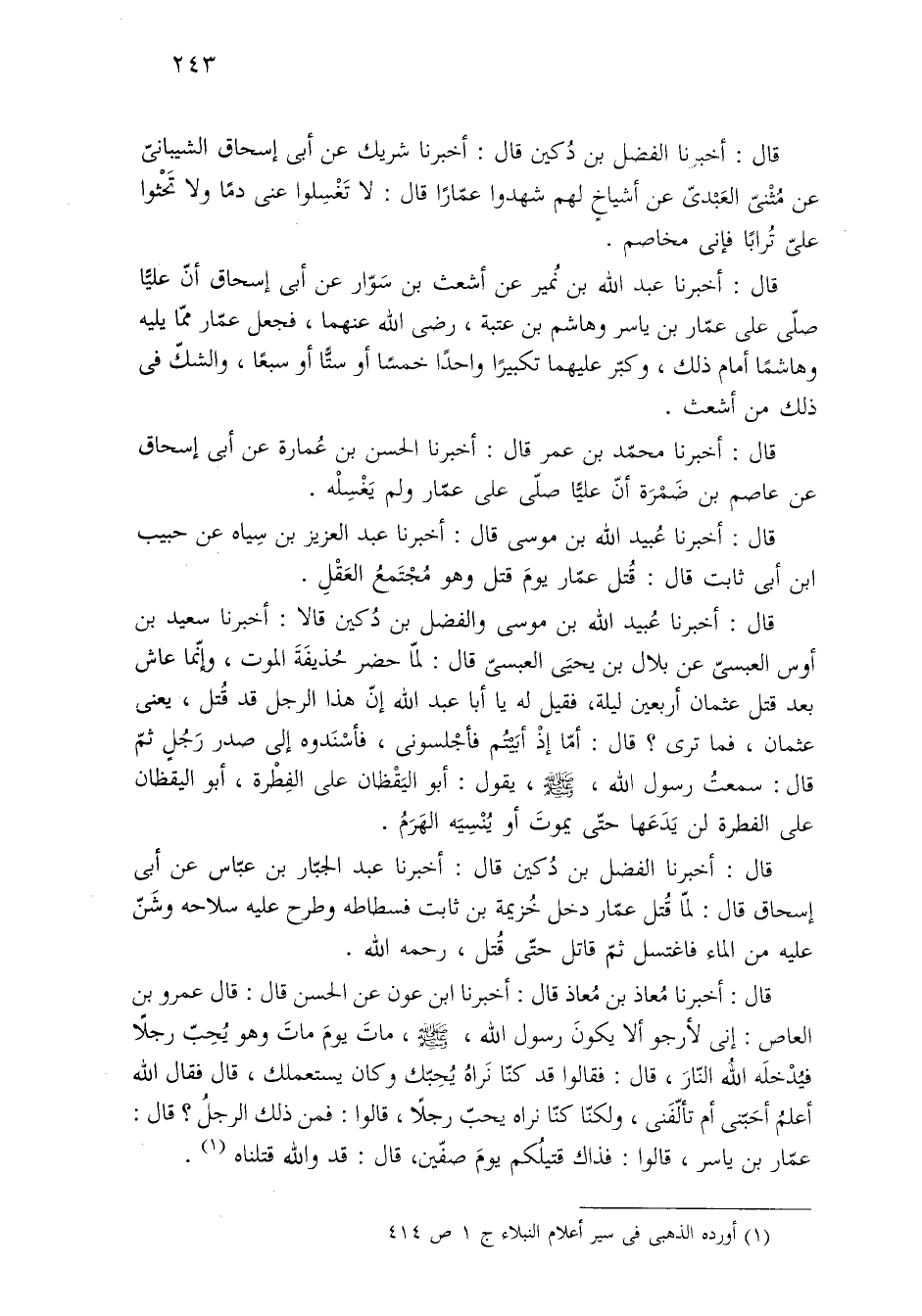 قال: أخبرنا الفضل بن دُكين قال: أخبرنا شريك عن أبي إسحاق الشيبانيّ عن مُثْنيّ العَبْديّ عن أشياخٍ لهم شهدوا عمّارًا قال: لا تَغْسِلوا عنى دمًا ولا تَحْثوا على تُرابًا فإنى مخاصم.