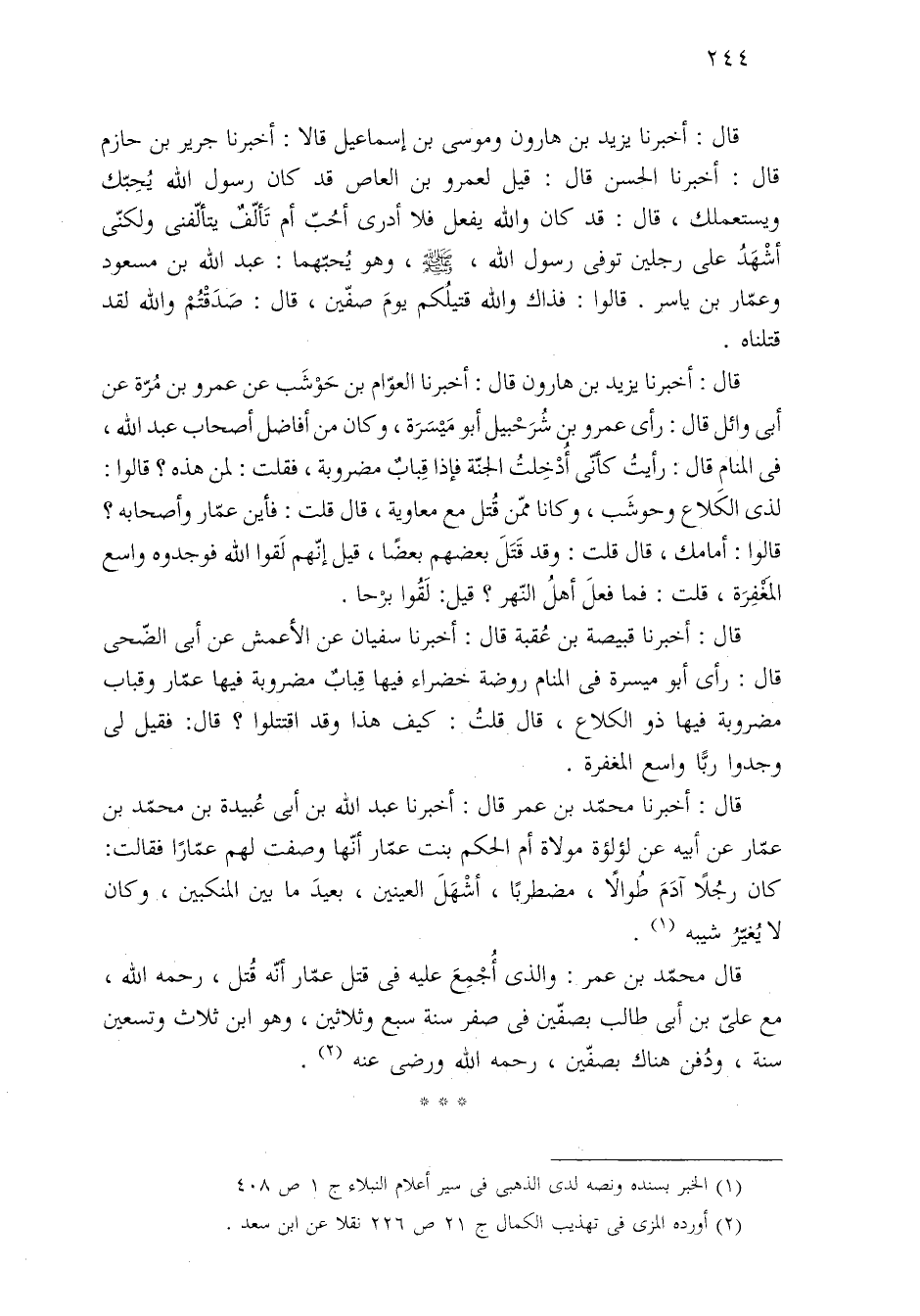 قال: أخبرنا يزيد بن هارون وموسى بن إسماعيل قالا: أخبرنا جرير بن حازم قال: أخبرنا الحسن قال: قيل لعمرو بن العاص قد كان رسول الله يُحِبّك ويستعملك، قال: قد كان والله يفعل فلا أدرى أحُبّ أم تَألّفٌ يتألّفنى ولكنّى أشْهَدُ على رجلين توفى رسول الله، - صلى الله عليه وسلم -، وهو يُحبّهما: عبد الله بن مسعود وعمّار بن ياسر. قالوا: فذاك والله قتيلُكم يومَ صفّين، قال: صَدَقْتُمْ والله لقد قتلناه.