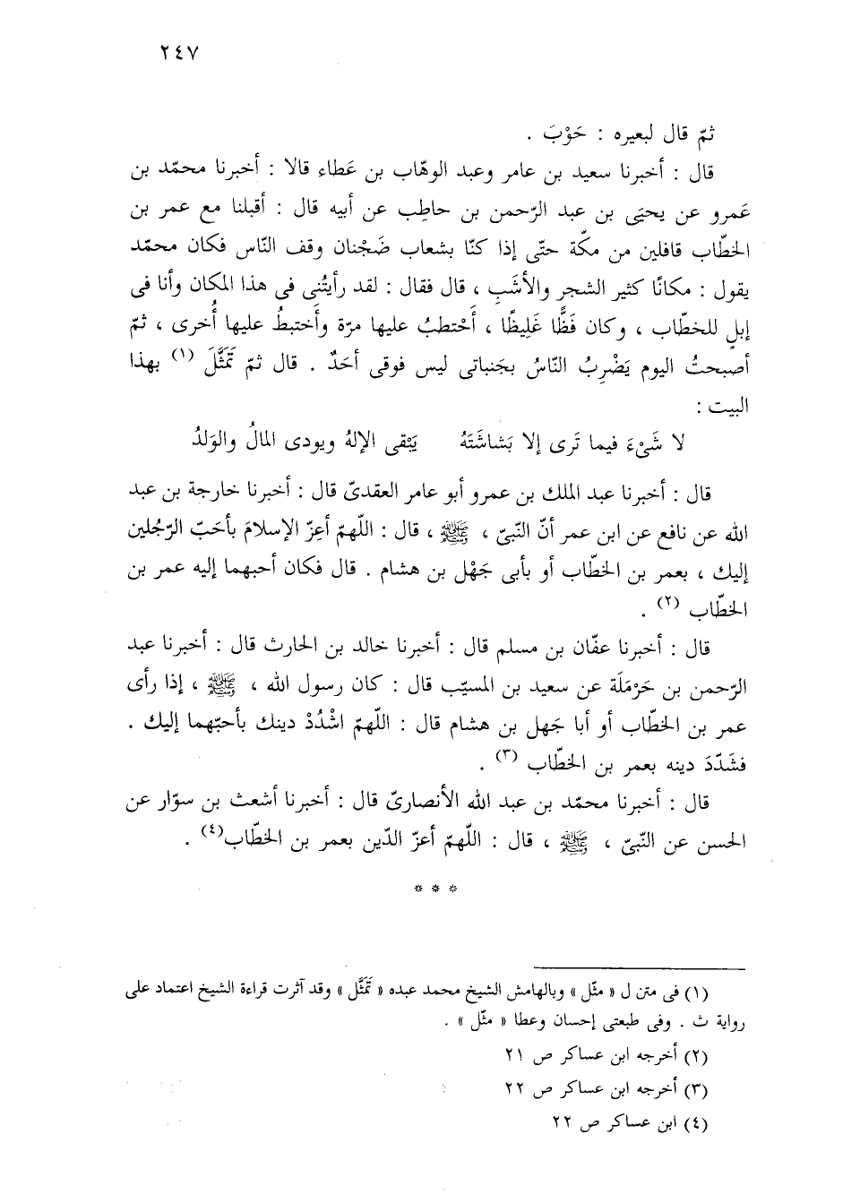قال: أخبرنا سعيد بن عامر وعبد الوهّاب بن عَطاء قالا: أخبرنا محمّد بن عَمرو عن يحيَى بن عبد الرّحمن بن حاطِب عن أبيه قال: أقبلنا مع عمر بن الخطّاب قافلين من مكّة حتَّى إذا كنّا بشعاب ضَجْنان وقف النّاس فكان محمّد يقول: مكانًا كثير الشجر والأشَبِ، قال فقال: لقد رأيتُنى في هذا المكان وأنا في إبلٍ للخطّاب، وكان فَظًّا غَلِيظًا، أَحْتطبُ عليها مرّة وأَختبطُ عليها أُخرى، ثمّ أصبحتُ اليوم يَضْرِبُ النّاسُ بجَنباتى ليس فوقى أحَدٌ. قال ثمّ تَمَثَّلَ (¬١) بهذا البيت:
