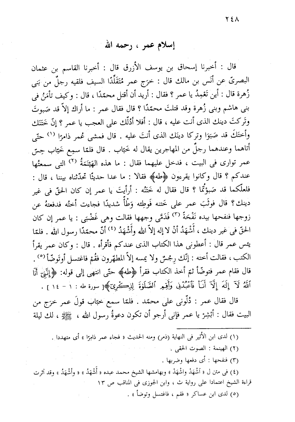 قال: أخبرنا إسحاق بن يوسف الأزرق قال: أخبرنا القاسم بن عثمان البصريّ عن أنَس بن مالك قال: خرَج عمر مُتَقَلِّدًا السيف فلقيه رجلٌ من بَنى زُهرة قال: أين تَعْمِدُ يا عمر؟ فقال: أريد أن أقتل محمّدًا، قال: وكيف تأمَنُ في بنى هاشم وبنى زُهرة ولد قتلتَ محمّدًا؟ قال فقال عمر: ما أراك إلّا قد صَبوتَ وتَركتَ دينك الذي أنت عليه، قال: أفلا أدُلّك على العجب يا عمر؟ إنّ خَتَنَك وأختَكَ قد صَبَوَا وتركا دينَك الذي أنتَ عليه. قال فمشى عُمر ذامرًا (¬١) حتَّى أتاهما وعندهما رجلٌ من المهاجرين يقال له خَبّاب. قال فلمّا سمِع خَبّاب حِسّ عمر توارى في البيت، فدخل عليهما فقال: ما هذه الهَيْنَمَةُ (¬٢) التي سمعتُها عندكم؟ قال وكانوا يقرءون {طه} فقالا: ما عدا حديثًا تحدّثناه بيننا، قال: فلعلّكما قد صَبوْتُما؟ قال فقال له خَتَنُه: أرأيتَ يا عمر إن كان الحقّ في غير دينك؟ قال فوثَبَ عمر على خَتنه فَوطِئه وَطْأً شديدًا فجاءت أختُه فدفعتهُ عن زوجها فنفحها بيده نَفْحَةً (¬٣) فَدَمَّى وجهها فقالت وهي غَضْبَى: يا عمر إن كان الحقّ في غير دينك، أَشْهَدُ أنْ لا إله إلّا الله وأَشْهَدُ (¬٤) أنّ محمّدًا رسول الله. فلمّا يئس عمر قال: أعطونى هذا الكتاب الذي عندكم فأقرأه. قال: وكان عمر يقرأ الكتب، فقالت أخته: إنّك رِجْسٌ ولا يمسه إلّا المطهّرون فقُمْ فاغتسل أو تَوضّأ (¬٥). قال فقام عمر فتوضّأ ثمّ أخذ الكتاب فقرأ {طه} حتَّى انتهى إلى قوله: {إِنَّنِي أَنَا اللَّهُ لَا إِلَهَ إِلَّا أَنَا فَاعْبُدْنِي وَأَقِمِ الصَّلَاةَ لِذِكْرِي} [سورة طه: ١ - ١٤].