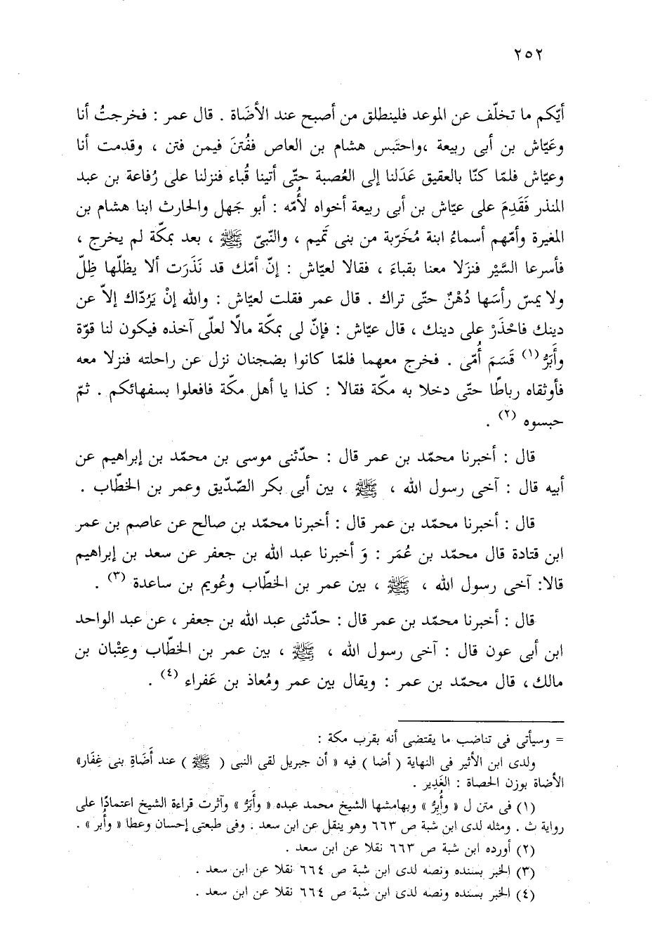 أيّكم ما تخلّف عن الموعد فلينطلق من أصبح عند الأضَاة. قال عمر: فخرجتُ أنا وعَيّاش بن أبي ربيعة، واحتَبس هشام بن العاص ففُتنَ فيمن فتن، وقدمت أنا وعيّاش فلمّا كنّا بالعقيق عَدَلنا إلى العُصبة حتَّى أتينا قُباء فنزلنا على رُفاعة بن عبد المنذر فَقَدِمَ على عيّاش بن أبي ربيعة أخواه لأُمّه: أبو جَهل والحارث ابنا هشام بن المغيرة وأمّهم أسماءُ ابنة مُخَرّبة من بنى تَميم، والنّبيّ - صلى الله عليه وسلم -، بعد بمكّة لم يخرج، فأسرعا السَّيْر فنزَلا معنا بقباءَ، فقالا لعيّاش: إنّ أمّك قد نَذَرَت ألا يظلّها ظِلّ ولا يمسّ رأسَها دُهْنٌ حتَّى تراك. قال عمر فقلت لعيّاش: والله إنْ يَرُدّاك إلّا عن دينك فاحْذَرْ على دينك، قال عيّاش: فإنّ لي بمكّة مالًا لعلّى آخذه فيكون لنا قوّة وأَبَرُّ (¬١) قَسَمَ أُمّى. فخرج معهما فلمّا كانوا بضجنان نزل عن راحلته فنزلا معه فأوثقاه رباطًا حتَّى دخلا به مكّة فقالا: كذا يا أهل مكّة فافعلوا بسفهائكم. ثمّ حبسوه (¬٢).