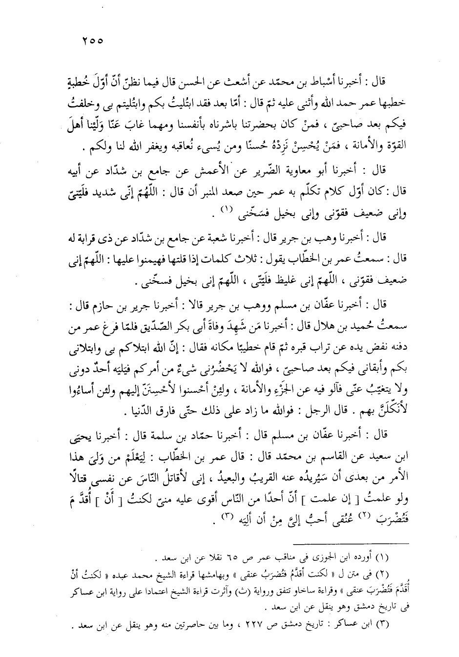 قال: أخبرنا عفّان بن مسلم قال: أخبرنا حمّاد بن سلمة قال: أخبرنا يحيَى بن سعيد عن القاسم بن محمّد قال: قال عمر بن الخطّاب: لِيَعْلَمْ من وَلىَ هذا الأمر من بعدى أن سيُريدُه عنه القريبُ والبعيدُ، إنى لأقاتلُ النّاسَ عن نفسى قتالًا ولو علمتُ [إن علمت] أنّ أحدًا هن النّاس أقوى عليه منيّ لكنتُ [أَنْ] أُقدَّمَ فَتُضْرَبَ (¬٢) عُنُقى أحبُّ إليَّ مِنْ أن ألِيَه (¬٣).
