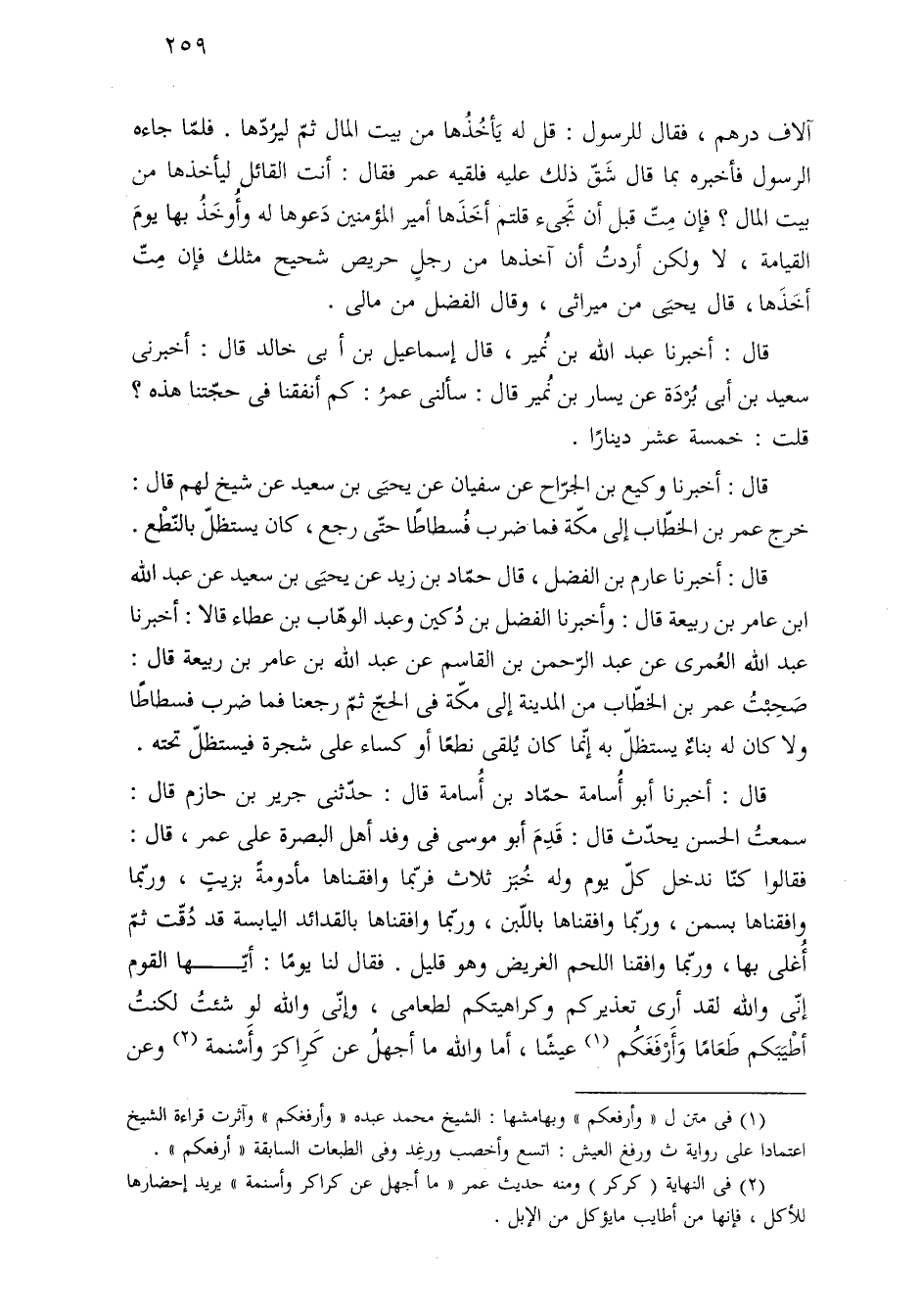 قال: أخبرنا عبد الله بن نُمير، قال إسماعيل بن أبي خالد قال: أخبرني سعيد بن أبي بُرْدَة عن يسار بن نُمير قال: سألنى عمرُ: كم أنفقنا في حجّتنا هذه؟ قلت: خمسة عشر دينارًا.