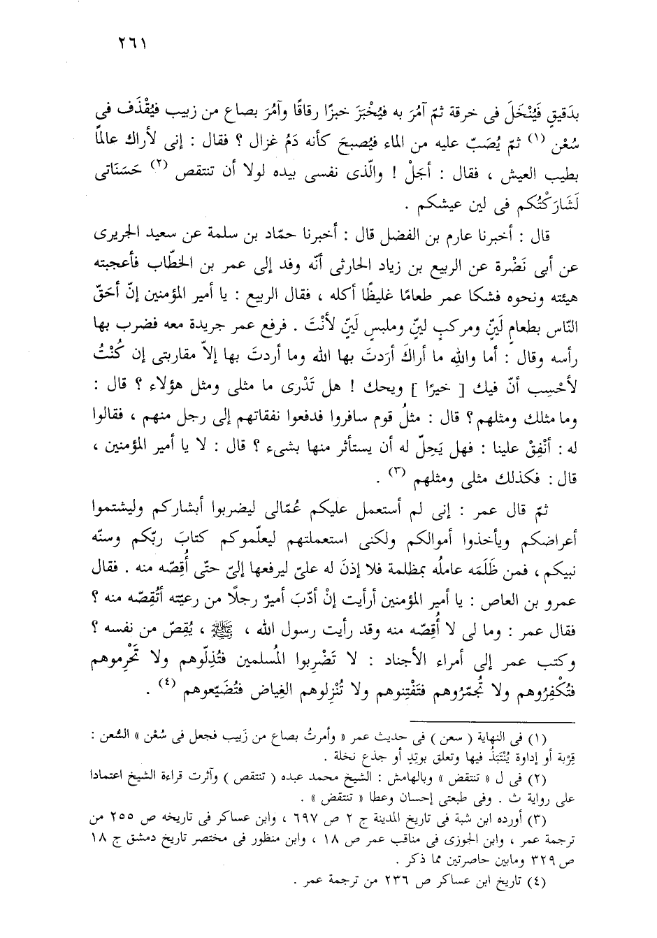 ثمّ قال عمر: إنى لم أستعمل عليكم عُمّالى ليضربوا أبشاركم وليشتموا أعراضكم ويأخذوا أموالكم ولكنى استعملتهم ليعلّموكم كتابَ ربّكم وسنّه نبيكم، فمن ظَلَمَه عاملُه بمظلمة فلا إذنَ له عليّ ليرفعها إليّ حتَّى أُقِصّه منه. فقال عمرو بن العاص: يا أمير المؤمنين أرأيت إنْ أدّبَ أميرٌ رجلًا من رعيّته أتُقِصّه منه؟ فقال عمر: وما لي لا أقِصّه منه وقد رأيت رسول الله، - صلى الله عليه وسلم -، يُقِصّ من نفسه؟ وكتب عمر إلى أمراء الأجناد. لا تَضْرِبوا المسُلمين فتُذِلّوهم ولا تَحْرِموهم فتُكْفِرُوهم ولا تُجمّرُوهم فتَفْتنوهم ولا تُنْزِلوهم الغِياض فتُضَيّعوهم (¬٤).