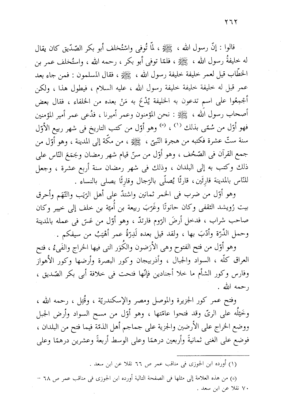 وهو أوّل من فتح الفتوح وهي الأرَضون والكُوَر التي فيها الخراج والفَئُ، فتح العراق كلّه، السواد والجبال، وأذربيجان وكور البصرة وأرضها وكور الأهواز وفارس وكور الشأم ما خلا أجنادين فإنّها فتحت في خلافة أبى بكر الصّديق، رحمه الله.