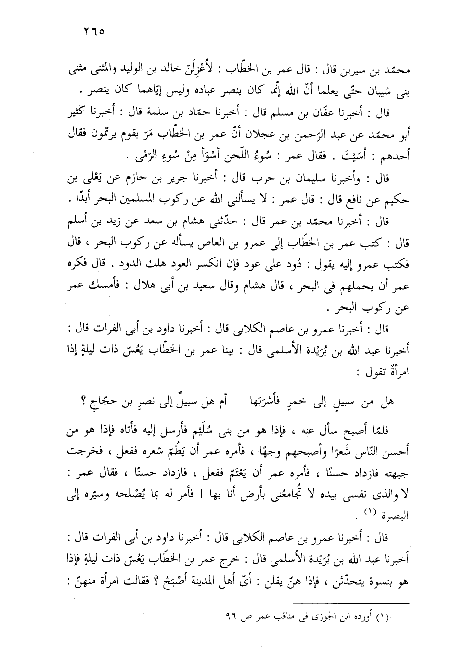 قال: أخبرنا عمرو بن عاصم الكلابى قال: أخبرنا داود بن أبي الفرات قال: أخبرنا عبد الله بن بُرَيْدة الأسلمى قال: خرج عمر بن الخطّاب يَعُسّ ذات ليلةٍ فإذا هو بنسوة يتحدّثن، فإذا هنّ يقلن: أيّ أهل المدينة أصْبَحُ؟ فقالت امرأة منهنّ: