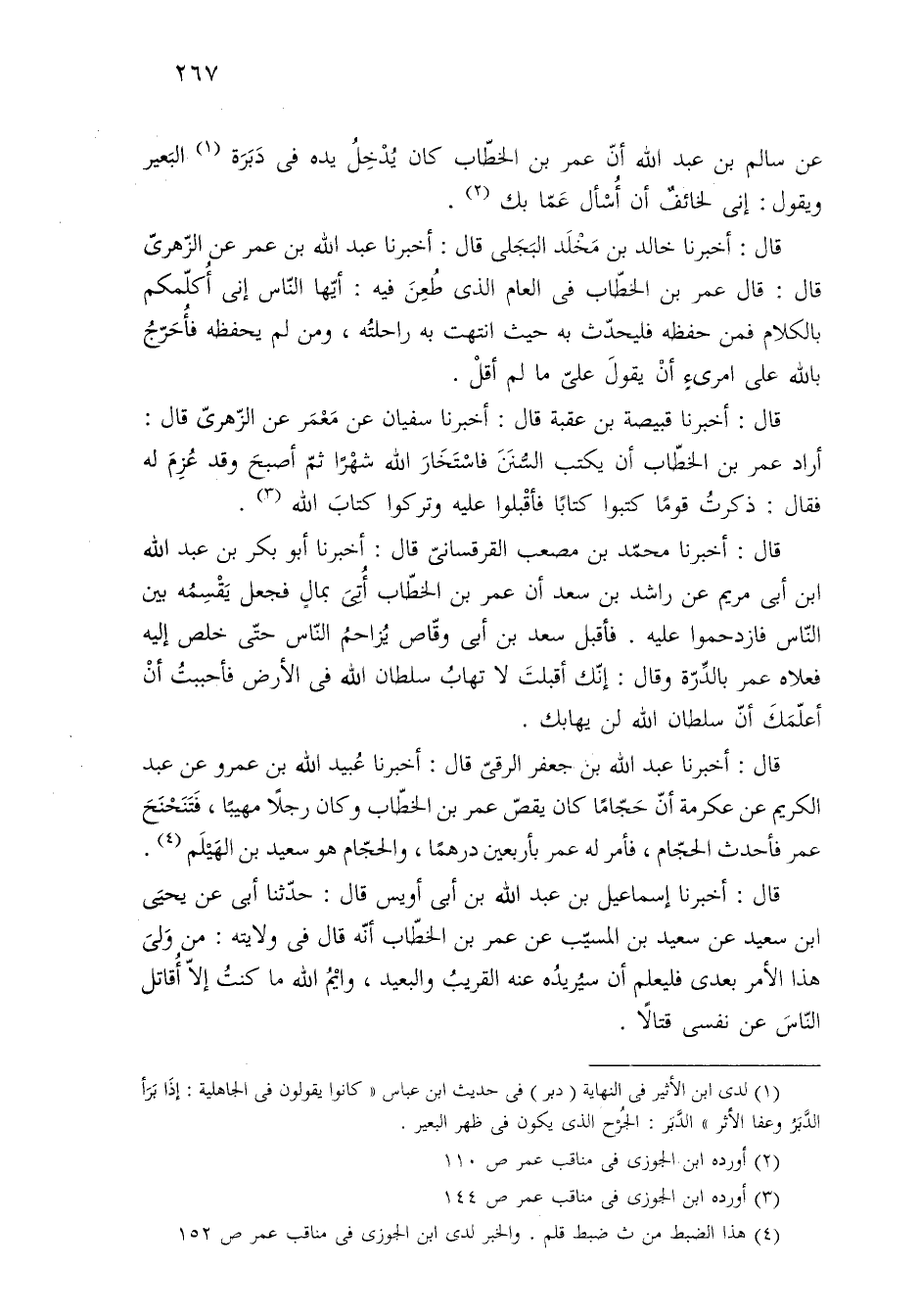 عن سالم بن عبد الله أنّ عمر بن الخطّاب كان يُدْخِلُ يده في دَبَرَة (¬١) البَعير ويقول: إنى لخائفٌ أن أُسْأل عَمّا بك (¬٢).