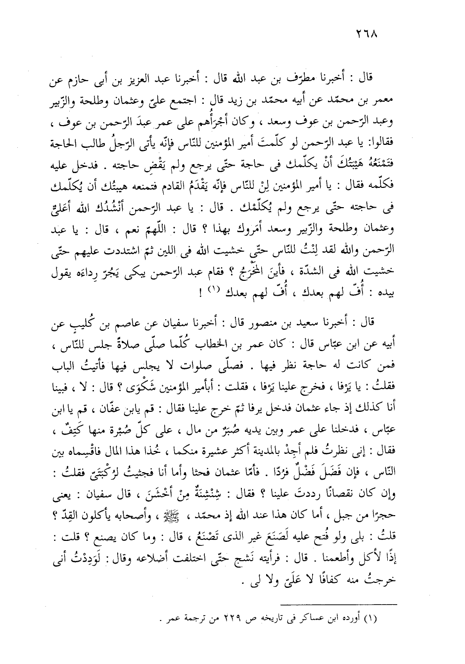 قال: أخبرنا سعيد بن منصور قال: أخبرنا سفيان عن عاصم بن كُليبٍ عن أبيه عن ابن عبّاس قال: كان عمر بن الخطاب كُلّما صلّى صلاةً جلس للنّاس، فمن كانت له حاجة نظر فيها. فصلّى صلوات لا يجلس فيها فأتيتُ الباب فقلتُ: يا يَرْفا، فخرج علينا يَرْفا، فقلت: أبأمير المؤمنين شَكْوَى؟ قال: لا، فبينا أنا كذلك إذ جاء عثمان فدخل يرفا ثمّ خرج علينا فقال: قم يابن عفّان، قم يا ابن عبّاس، فدخلنا على عمر وبين يديه صُبَرٌ من مال، على كلّ صُبْرة منها كَتِفٌ، فقال: إنى نظرتُ فلم أجِدْ بالمدينة أكثر عشيرة منكما، خُذا هذا المال فاقْسِماه بين النّاس، فإن فَضَلَ فَضْلٌ فرُدّا. فأمّا عثمان فحثا وأما أنا فجثيتُ لرُكْبَتَيّ فقلتُ: وإن كان نقصانًا رددتَ علينا؟ فقال: شِنْشِنَةٌ مِنْ أخْشَنَ، قال سفيان: يعني حجرًا من جبل، أما كان هذا عند الله إذ محمّد، - صلى الله عليه وسلم -، وأصحابه يأكلون القِدّ؟ قلتُ: بلى ولو فُتح عليه لَصَنَعَ غير الذي تَصْنَعُ، قال: وما كان يصنع؟ قلت: إذًا لأكل وأطعمنا. قال: فرأيته نَشج حتَّى اختلفت أضلاعه وقال: لَوَدِدْتُ أنى خرجتُ منه كفافًا لا عَلَيّ ولا لي.