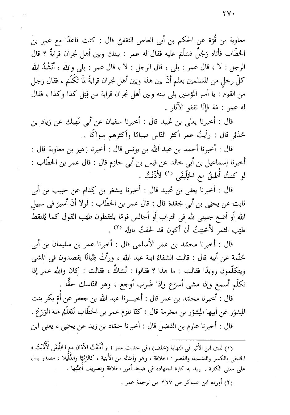 (¬٢) أورده ابن عساكر ص ٢٦٧ من ترجمة عمر.