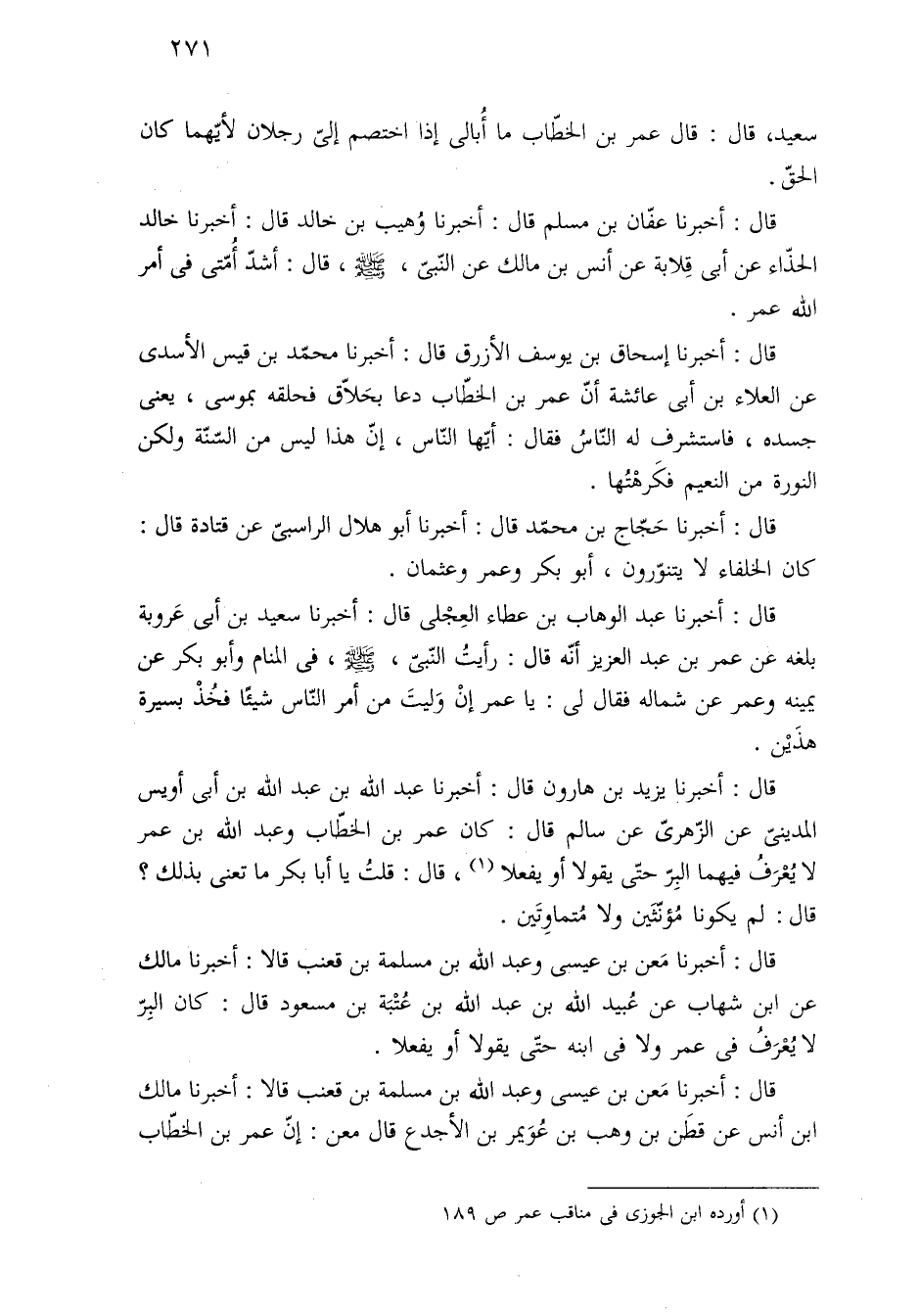 قال: أخبرنا عفّان بن مسلم قال: أخبرنا وُهيب بن خالد قال: أخبرنا خالد الحذّاء عن أبي قِلابة عن أنس بن مالك عن النّبيّ، - صلى الله عليه وسلم -، قال: أشدّ أُمّتى في أمر الله عمر.