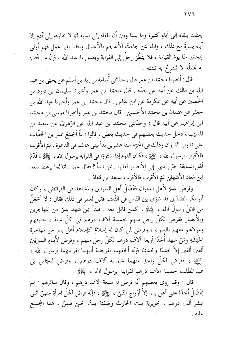 قال: أخبرنا محمّد بن عمر قال: حدّثني أُسامة بن زيد بن أسلم عن يحيَى بن عبد الله بن مالك عن أبيه عن جدّه. قال محمّد بن عمر وأخبرنا سليمان بن داود بن الحُصين عن أبيه عن عكرمة عن ابن عبّاس. قال محمّد بن عمر وأخبرنا عبد الله بن جعفر عن عثمان بن محمّد الأخنسيّ. قال محمّد بن عمر وأخبرنا موسى بن محمّد بن إبراهيم عن أبيه قال: وحدّثنى محمّد بن عبد الله عن الزّهريّ عن سعيد بن المسيّب، دخل حديث بعضهم في حديث بعض، قالوا: لمّا أجْمَعَ عمر بن الخطّاب على تدوين الديوان وذلك في المحرّم سنة عشرين بدأ ببنى هاشم في الدعوة، ثمّ الأقرب فالأقرب برسول الله، - صلى الله عليه وسلم -، فكان القوم إذا اسْتَوَوْا في القرابة برسول الله، - صلى الله عليه وسلم -، قَدّمَ أهْل السابقة حتَّى انتهى إلى الأنصار فقالوأ: بمن نبدأ؟ فقال عمر: ابْدَءُوا برهط سعد بن مُعاذ الأشهليّ ثمّ الأقرب فالأقرب بسعد بن مُعاذ.