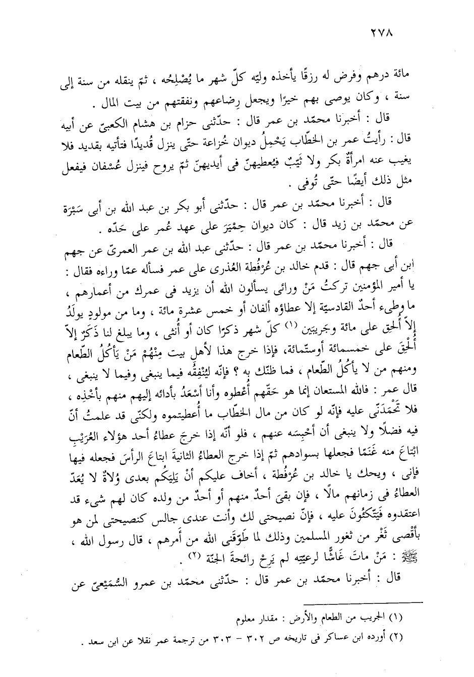 قال: أخبرنا محمّد بن عمر قال: حدّثني عبد الله بن عمر العمريّ عن جهم بن أبي جهم قال: قدم خالد بن عُرْفُطة العُذرى على عمر فسأله عمّا وراءه فقال: يا أمير المؤمنين تركتُ مَنْ ورائى يسألون الله أن يزيد في عمرك من أعمارهم، ما وطئ أحدٌ القادسيّة إلا عطاؤه ألفان أو خمس عشرة مائة، وما من مولودٍ يولَدُ إلّا أُلحِق على مائة وجَريبَين (¬١) كلّ شهر ذكرًا كان أو أُنثى، وما يبلغ لنا ذَكَرٌ إلّا أُلْحِقَ على خمسمائة أو ستّمائة، فإذا خرج هذا لأهلِ بيت مِنْهُمْ مَنْ يَأكُلُ الطّعام ومنهم من لا يأكُلُ الطّعام، فما ظنّك به؟ فإنّه ليُنْفِقُه فيما ينبغي وفيما لا ينبغي، قال عمر: فالله المستعان إنما هو حَقّهم أُعْطوه وأنا أسْعَدُ بأدائه إليهم منهم بأخْذِه, فلا تَحْمَدَنّى عليه فإنّه لو كان من مال الخطّاب ما أُعطيتموه ولكنّى قد علمتُ أنّ فيه فضلًا ولا ينبغي أن أحْبِسَه عنهم، فلو أنّه إذا خرجَ عطاءُ أحد هؤلاء العُرَيْبِ ابْتاعَ منه غَنَمًا فجعلها بسوادهم ثمّ إذا خرج العطاءُ الثانيةَ ابتاعَ الرأسَ فجعله فيها فإنى، ويحك يا خالد بن عُرْفُطة، أخاف عليكم أنْ يَلِيَكُم بعدى وُلاةٌ لا يُعَدّ العطاءُ في زمانهم مالًا، فإن بقىَ أحدٌ منهم أو أحدٌ من ولده كان لهم شئ قد اعتقدوه فَيَتّكئُونَ عليه، فإنّ نصيحتى لك وأنت عندي جالس كنصيحتى لمن هو بأقْصى ثَغْر من ثغور المسلمين وذلك لما طَوّقَنى الله من أَمرهم، قال رسول الله، - صلى الله عليه وسلم -: مَنْ ماتَ غَاشًّا لرعيّتِه لم يَرِحْ رائحةَ الجنّة (¬٢).
