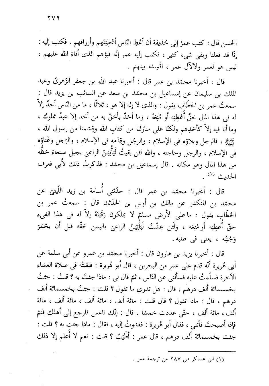 قال: أخبرنا محمّد بن عمر قال: حدّثني أُسامة بن زيد اللّيثيّ عن محمّد بن المنكدر عن مالك بن أوس بن الحدَثان قال: سمعتُ عمر بن الخطّاب يقول: ما على الأرض مسلمٌ لا يملكون رَقَبَتَهُ إلّا له في هذا الفئ حقّ أُعطِيَه أو مُنِعَه، ولَئن عِشْتُ لَيَأتِيَنّ الراعىَ باليمن حَقّه قبل أن يحْمَرّ وَجْهُه، يعني في طلبه.
