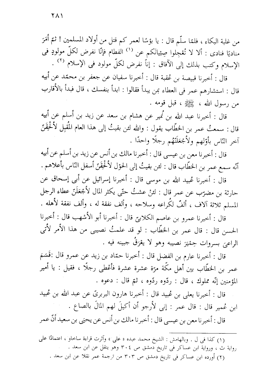 قال: أخبرنا عبد الله بن نُمير عن هشام بن سعد عن زيد بن أسلم عن أبيه قال: سمعتُ عمر بن الخطّاب يقول: والله لئن بقيتُ إلى هذا العام المُقبِل لألْحِقَنّ آخر النّاس بأوّلهم ولأجْعَلَنّهُم رجلًا واحدًا.