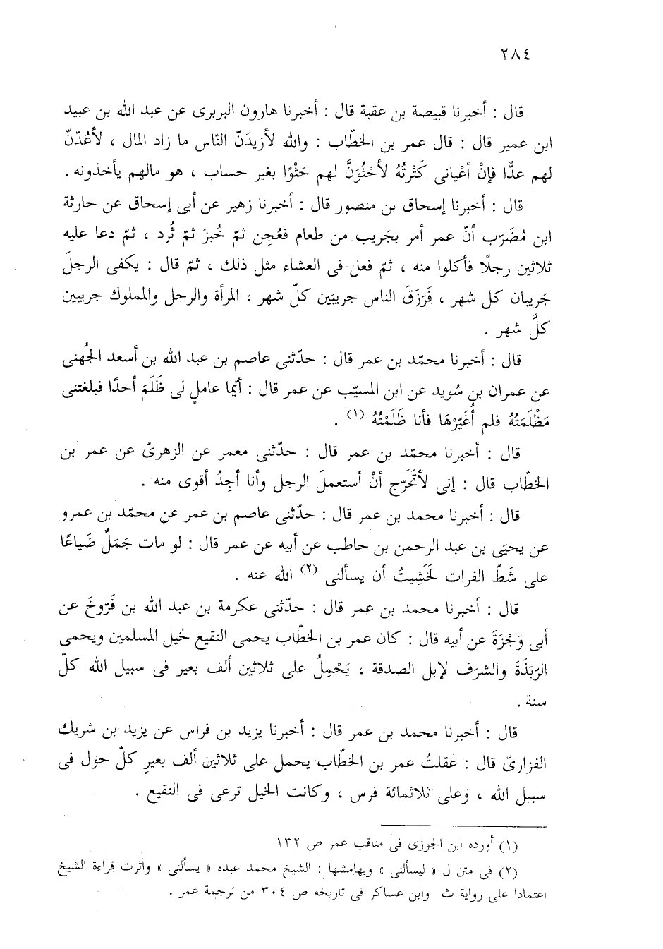 قال: أخبرنا محمد بن عمر قال: أخبرنا يزيد بن فراس عن يزيد بن شريك الفزاريّ قال: عقلتُ عمر بن الخطّاب يحمل على ثلاثين ألف بعيرٍ كلّ حول فى سبيل الله، وعلى ثلاثمائة فرس، وكانت الخيل ترعى فى النقيع.