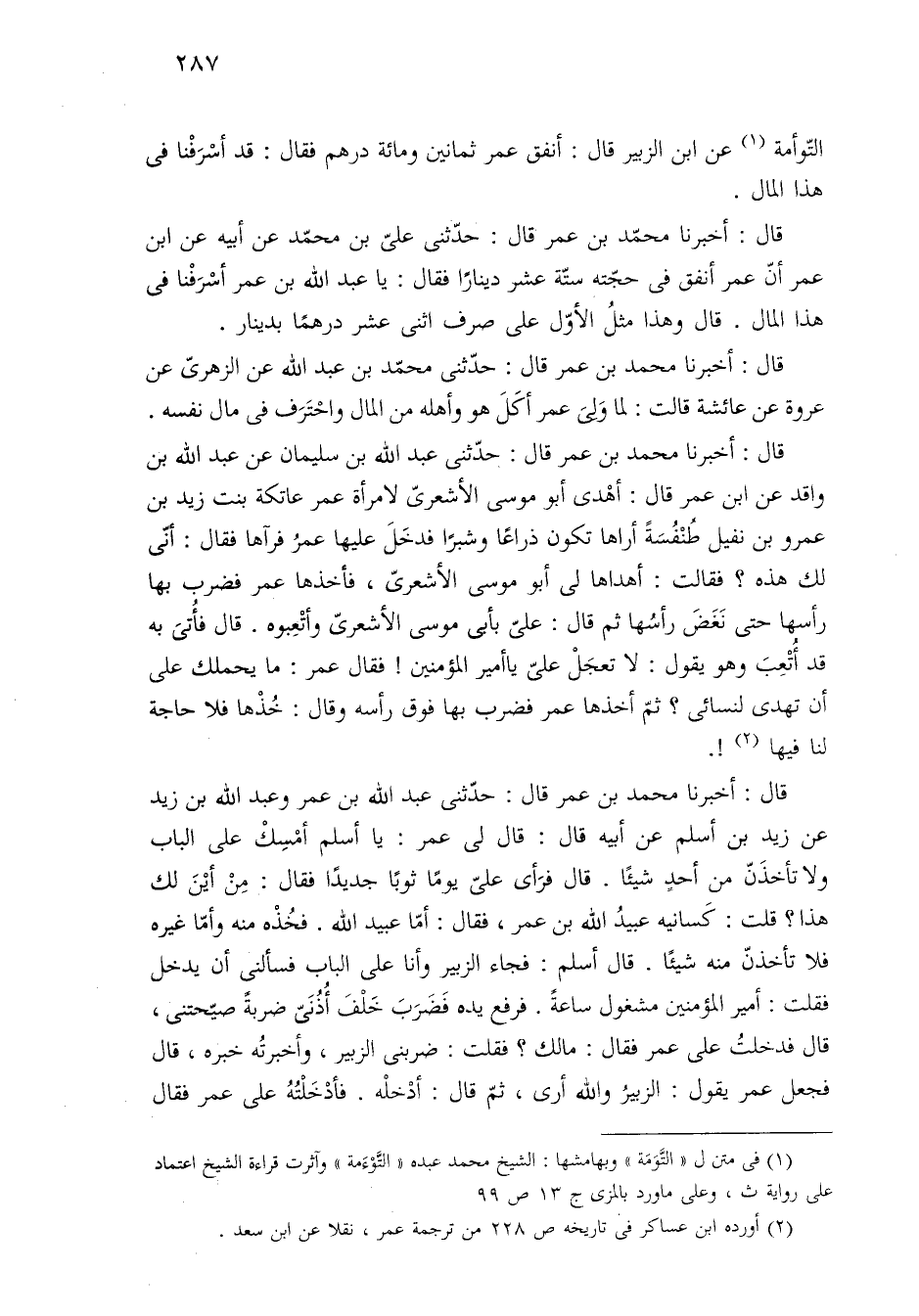 التّوأمة (¬١) عن ابن الزبير قال: أنفق عمر ثمانين ومائة درهم فقال: قد أسْرَفْنا في هذا المال.
