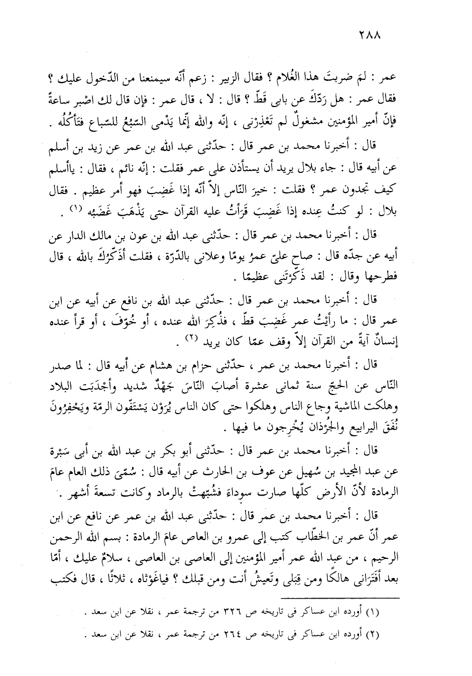 قال: أخبرنا محمد بن عمر قال: حدّثنى عبد الله بن عمر عن نافع عن ابن عمر أنّ عمر بن الخطّاب كتب إلى عمرو بن العاص عامَ الرمادة: بِسْمِ اللَّهِ الرَّحْمَنِ الرَّحِيمِ، من عبد الله عمر أمير المؤمنين إلى العاصي بن العاصي، سلامٌ عليك، أمّا بعد أفَتَرَانى هالكًا ومن قِبَلى وتَعيشُ أنت ومن قبلك؟ فياغَوْثاه، ثلاثًا، قال فكتب
