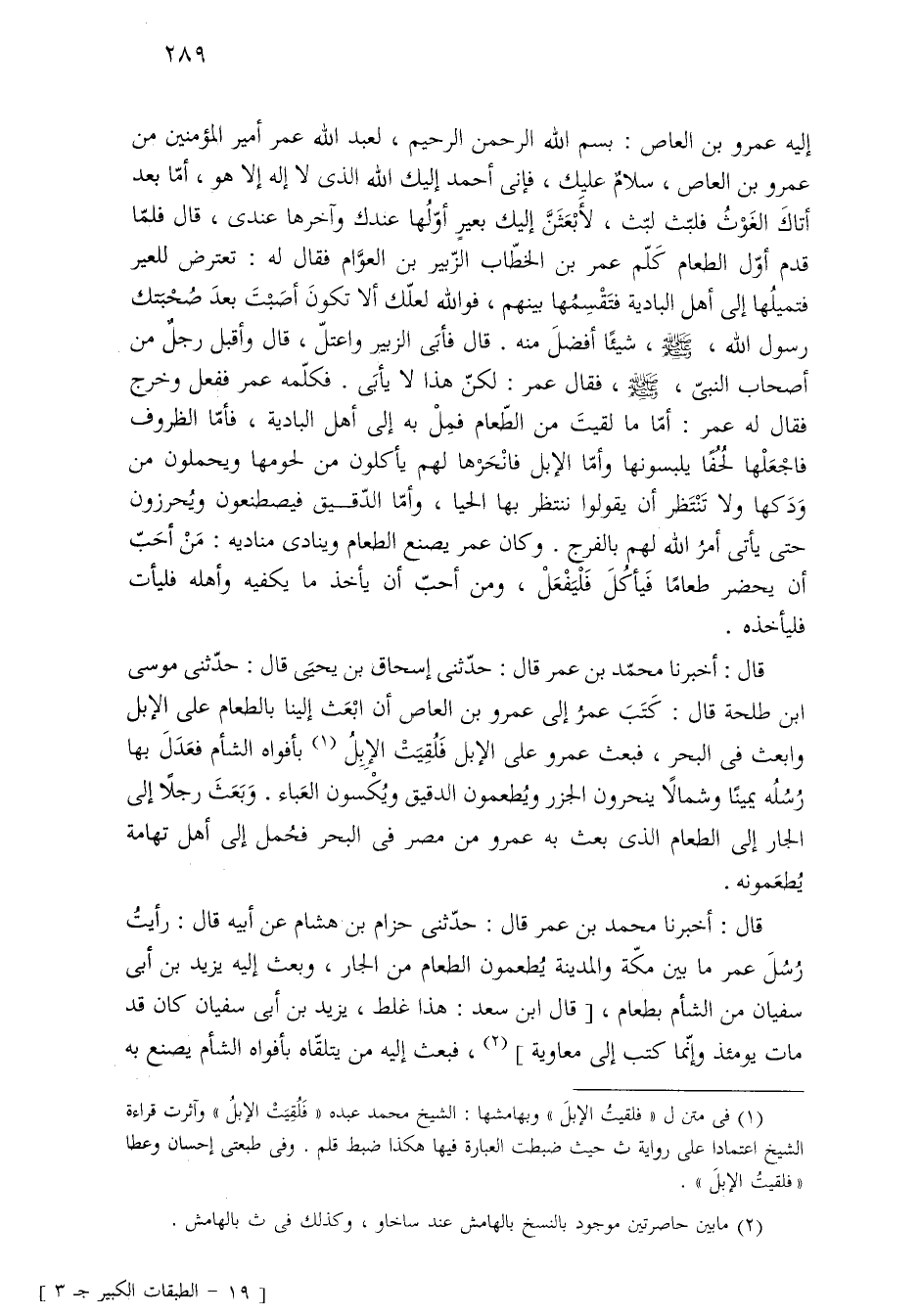 قال: أخبرنا محمّد بن عمر قال: حدّثنى إسحاق بن يحيَى قال: حدّثنى موسى ابن طلحة قال: كَتَبَ عمرُ إلى عمرو بن العاص أن ابْعَث إلينا بالطعام على الإبل وابعث في البحر، فبعث عمرو على الإبل فَلُقِيَتْ الإبِلُ (¬١) بأفواه الشأم فعَدَلَ بها رُسُلُه يمينًا وشمالًا ينحرون الجزر ويُطعمون الدقيق ويُكسون العَباء. وَبَعَثَ رجلًا إلى الجار إلى الطعام الذى بعث به عمرو من مصر في البحر فحُمل إلى أهل تهامة يُطعَمونه.