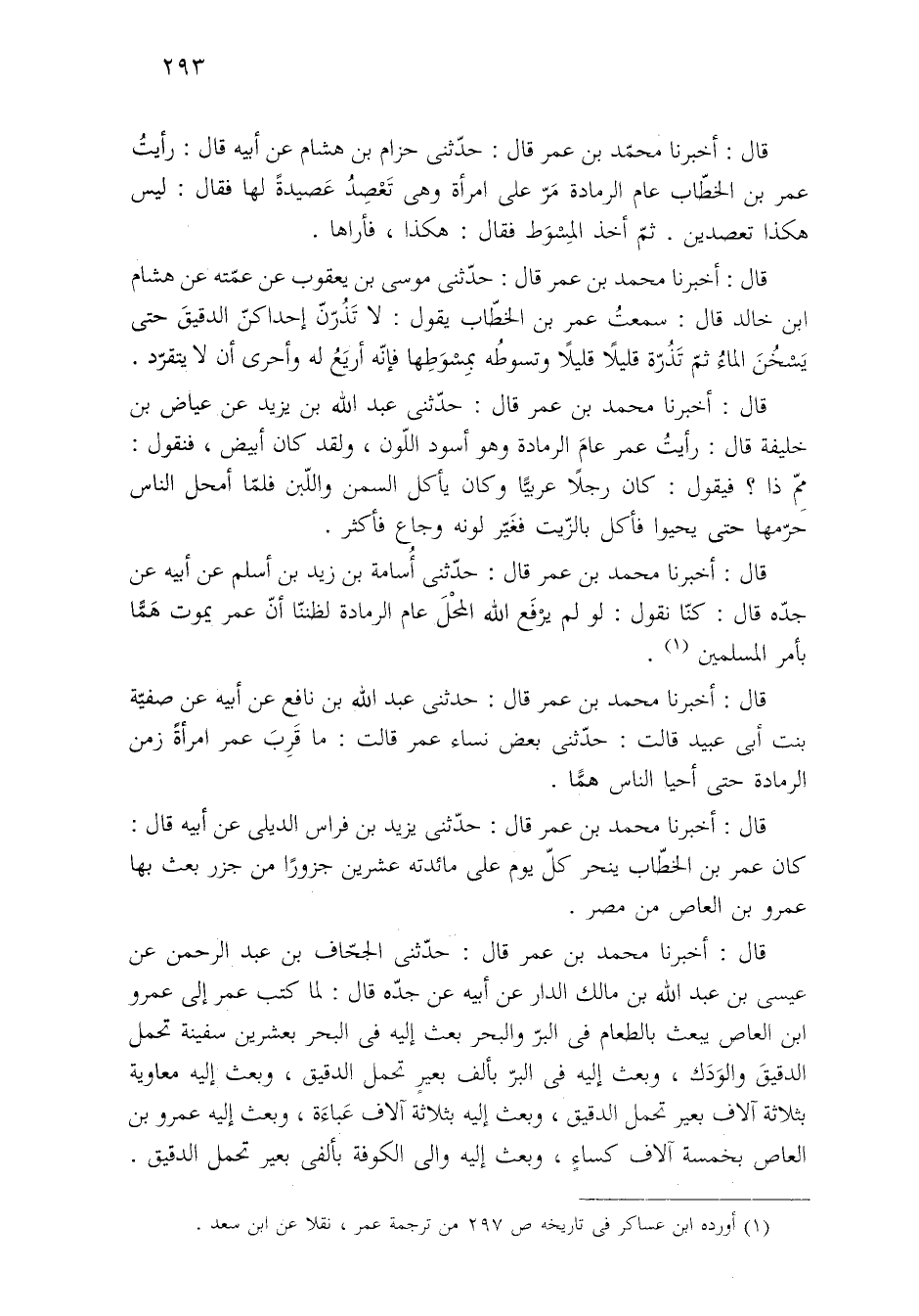 قال: أخبرنا محمّد بن عمر قال: حدّثنى حزام بن هشام عن أبيه قال: رأيتُ عمر بن الخطّاب عام الرمادة مَرّ على امرأة وهى تَعْصِدُ عَصيدةً لها فقال: ليس هكذا تعصدين. ثمّ أخذ المِسْوَط فقال: هكذا، فأراها.