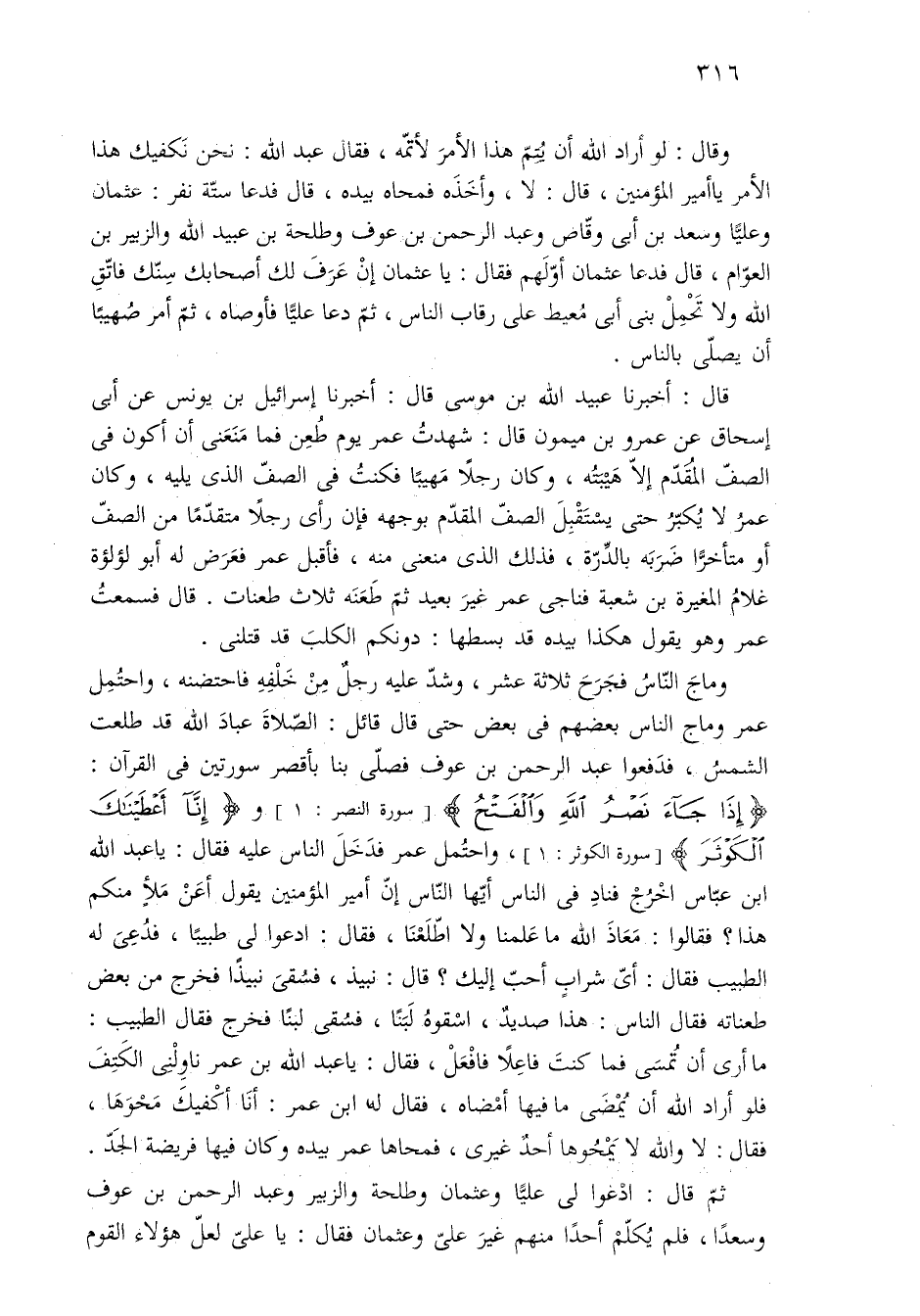 وماجَ النّاسُ فجَرَحَ ثلاثة عشر، وشدّ عليه رجلٌ مِنْ خَلْفِهِ فاحتضنه، واحتُمِل عمر وماج الناس بعضهم في بعض حتى قال قائل: الضلاةَ عبادَ الله قد طلعت الشمسُ، فدَفعوا عبد الرحمن بن عوف فصلّى بنا بأقصر سورتين في القرآن: {إِذَا جَاءَ نَصْرُ اللَّهِ وَالْفَتْحُ} [سورة النصر: ١] و {إِنَّا أَعْطَيْنَاكَ الْكَوْثَرَ} [سورة الكوثر: ١]، واحتُمل عمر فدَخَلَ الناس عليه فقال: يا عبد الله ابن عبّاس اخْرُجْ فنادِ في الناس أيّها النّاس إنّ أمير المؤمنين يقول أعَن مَلأٍ منكم هذا؟ فقالوا: مَعَاذَ الله ما عَلمنا ولا اطّلَعْنَا، فقال: ادعوا لى طبيبًا، فدُعِىَ له الطبيب فقال: أىّ شرابٍ أحبّ إليك؟ قال: نبيذ، فسُقىَ نبيذًا فخرج من بعض طعناته فقال الناس: هذا صديدٌ، اسْقوهُ لَبَنًا، فسُقى لبنًا فخرج فقال الطيب: ما أرى أن تُمسَى فما كنتَ فاعِلًا فافْعَلْ، فقال: يا عبد الله بن عمر ناوِلْنِى الكَتِفَ فلو أراد الله أن يُمْضَى ما فيها أمْضاه، فقال له ابن عمر: أنَا أكْفيكَ مَحْوَهَا، فقال: لا والله لا يَمْحُوها أحدٌ غيرى، فمحاها عمر بيده وكان فيها فريضة الجَدّ.