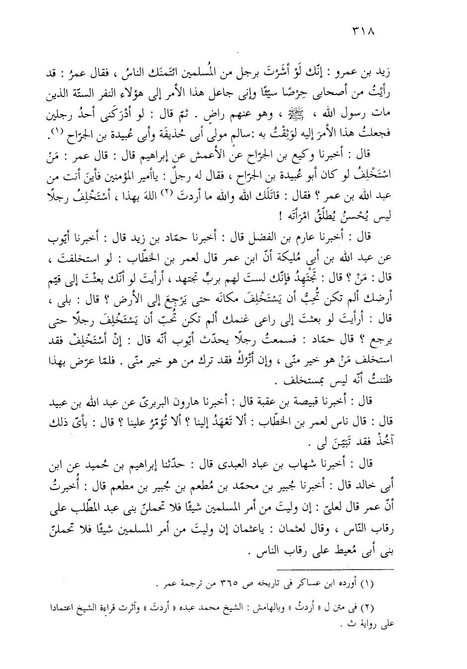 قال: أخبرنا عارم بن الفضل قال: أخبرنا حمّاد بن زيد قال: أخبرنا أيّوب عن عبد الله بن أبى مُليكة أنّ ابن عمر قال لعمر بن الخطّاب: لو استخلفتَ، قال: مَنْ؟ قال: تَجتَهِدُ فإنّك لستَ لهم بربِّ تجتهد، أرأيتَ لو أنّك بعثْتَ إلى قيّم أرضك ألم تكن تُحِبُّ أن يَسْتَخْلِفَ مكانَه حتى يَرْجِعَ إلى الأرض؟ قال: بلى، قال: أرأيتَ لو بعثتَ إلى راعى غنمك ألم تكن تحبّ أن يَسْتَخْلِفَ رجلًا حتى يرجع؟ قال حمّاد: فسمعتُ رجلًا يحدّث أيّوب أنّه قال: إنْ أسْتَخْلِفْ فقد استخلف مَنْ هو خير منّى، وإن أتْرُكْ فقد ترك من هو خير منّى. فلمّا عرّض بهذا ظننتُ أنّه ليس بمستخلف.