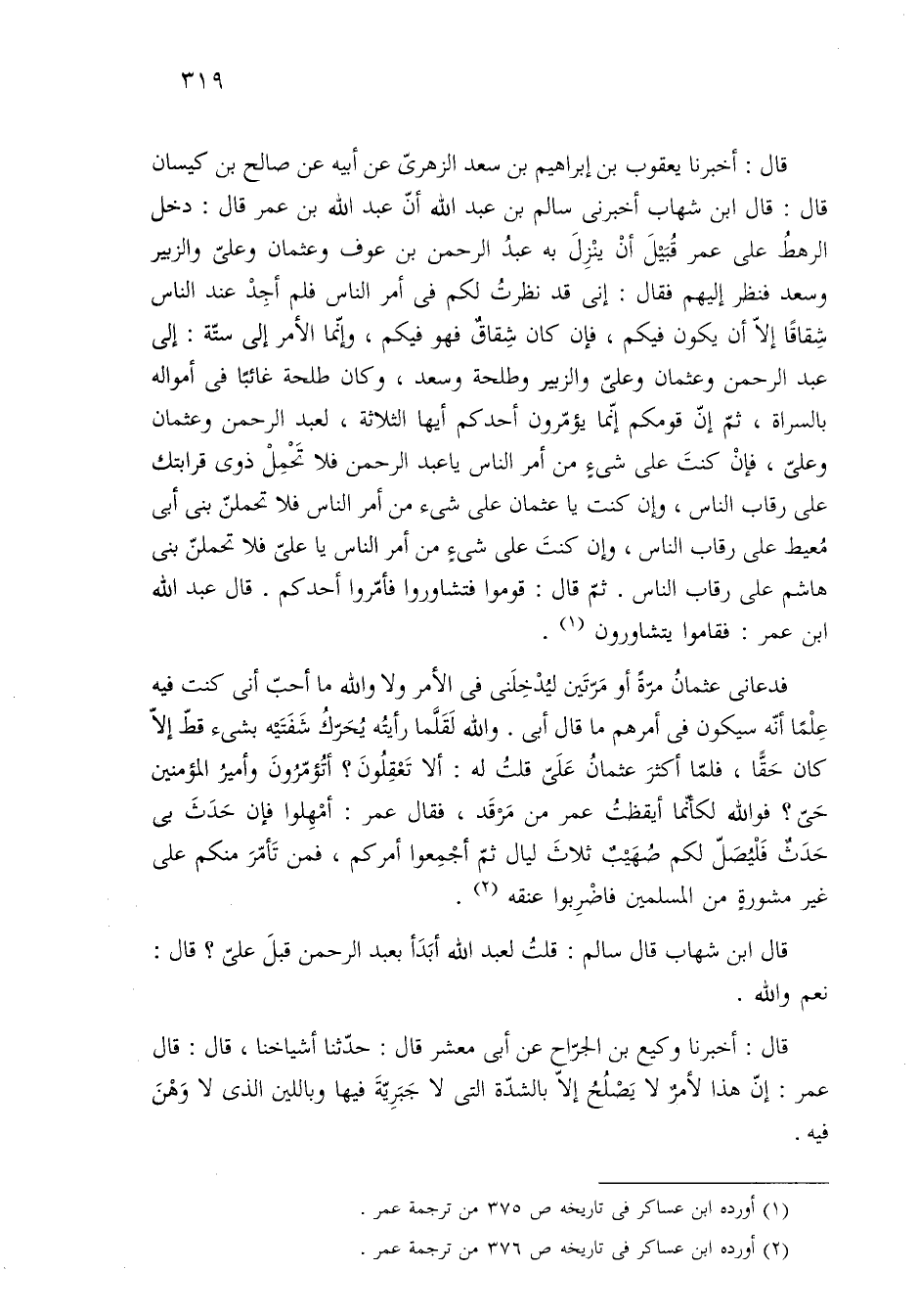 قال: أخبرنا يعقوب بن إبراهيم بن سعد الزهرىّ عن أبيه عن صالح بن كيسان قالك قال ابن شهاب أخبرنى سالم بن عبد الله أنّ عبد الله بن عمر قال: دخل الرهطُ على عمر قُبَيْلَ أنْ ينْزِلَ به عبدُ الرحمن بن عوف وعثمان وعليّ والزبير وسعد فنظر إليهم فقال: إنى قد نظرتُ لكم في أمر الناس فلم أجِدْ عند الناس شِقاقًا إلّا أن يكون فيكم، فإن كان شِقاقٌ فهو فيكم، وإنّما الأمر إلى ستّة: إلى عبد الرحمن وعثمان وعليّ والزبير وطلحة وسعد، وكان طلحة غائبًا في أمواله بالسراة، ثمّ إنّ قومكم إنّما يؤمّرون أحدكم أيها الثلاثة، لعبد الرحمن وعثمان وعلىّ، فإنْ كنتَ على شيءٍ من أمر الناس يا عبد الرحمن فلا تَحْمِلْ ذوى قرابتك على رقاب الناس، وإن كنت يا عثمان على شئ من أمر الناس فلا تحملنّ بنى أبى مُعيط على رقاب الناس، وإن كنتَ على شئٍ من أمر الناس يا علىّ فلا تحملنّ بنى هاشم على رقاب الناس. ثمّ قال: قوموا فتشاوروا فأمّروا أحدكم. قال عبد الله ابن عمر: فقاموا يتشاورون (¬١).