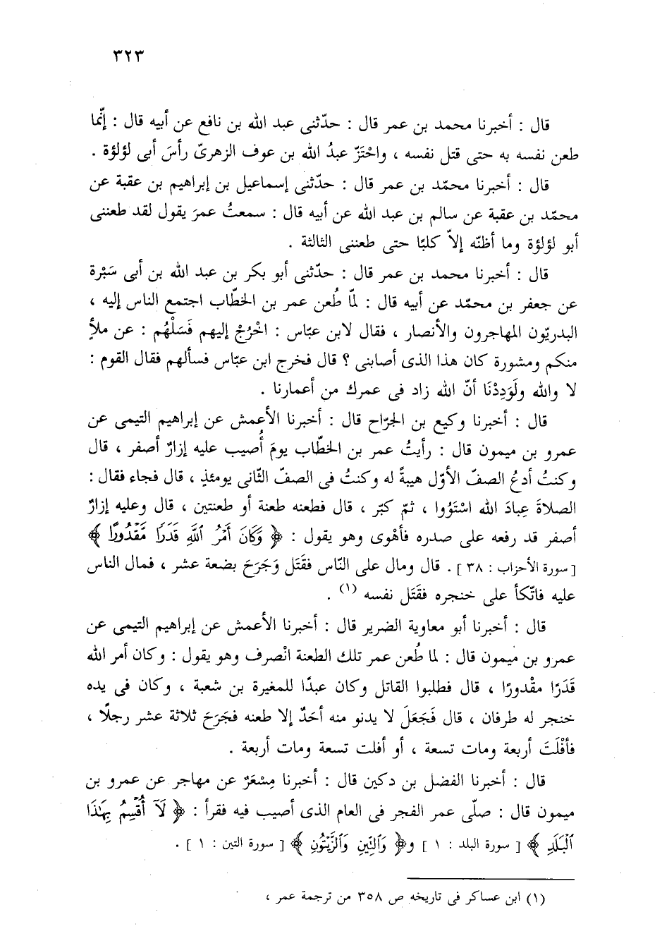 قال: أخبرنا الفضل بن دكين قال: أخبرنا مِسْعَرٌ عن مهاجر عن عمرو بن ميمون قال: صلّى عمر الفجر في العام الذى أصيب فيه فقرأ: {لَا أُقْسِمُ بِهَذَا الْبَلَدِ} [سورة البلد: ١] و {وَالتِّينِ وَالزَّيْتُونِ} [سورة التين: ١].