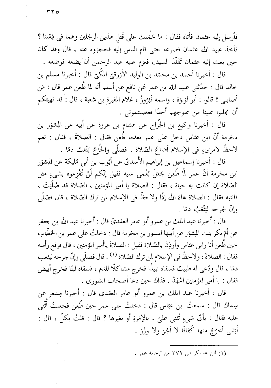 قال: أخبرنا وكيع بن الجّراح عن هشام بن عروة عن أبيه عن المِسْوَر بن مخرمة أنّ ابن عبّاس دخل على عمر بعدما طُعن فقال: الصلاةَ، فقال: نعم لاحظّ لامرئٍ في الإسلام أضاعَ الصّلاة. فصلّى والجُرْحُ يَثْعَبُ دمًا.