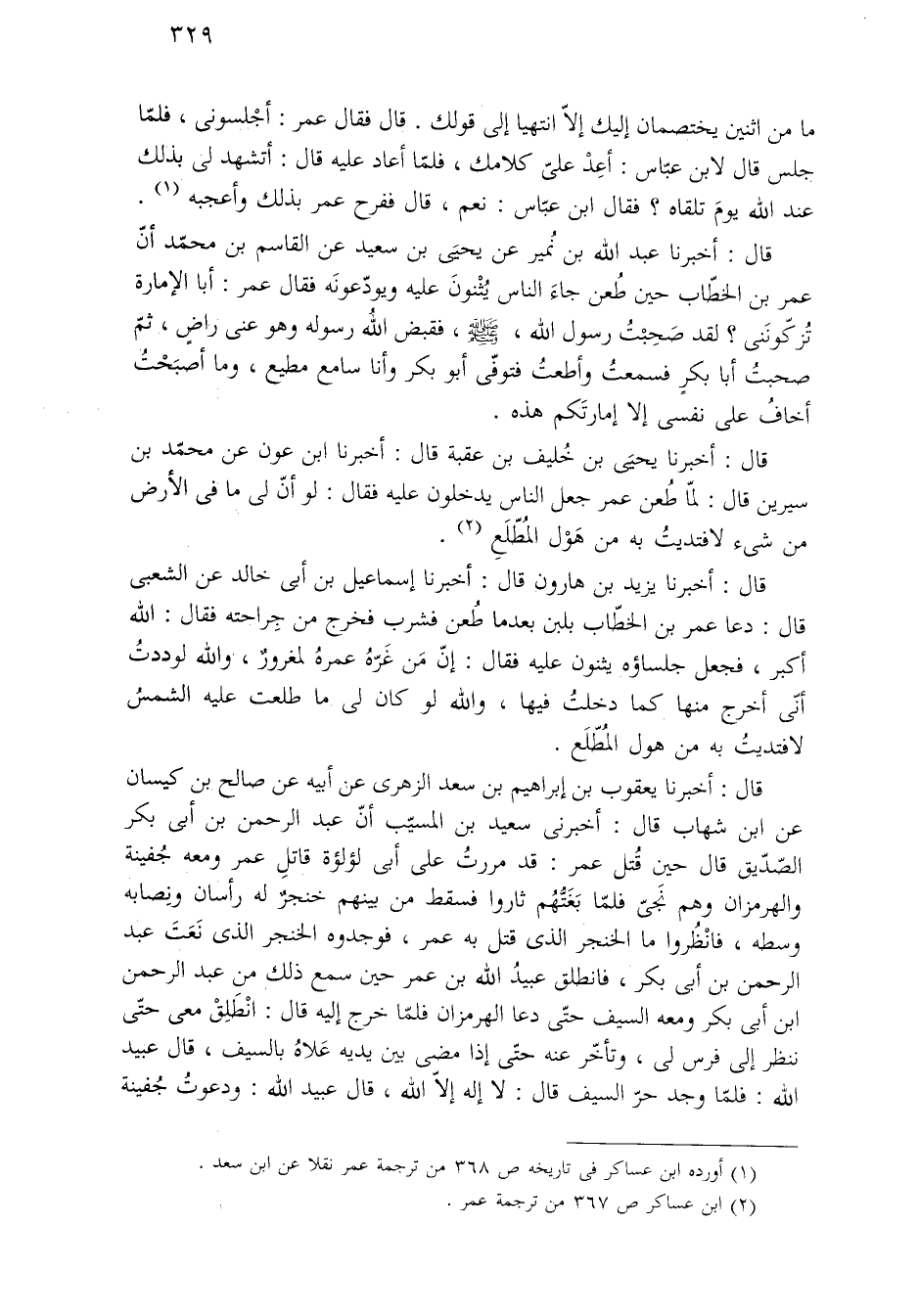 قال: أخبرنا يعقوب بن إبراهيم بن سعد الزهرى عن أبيه عن صالح بن كيسان عن ابن شهاب قال: أخبرنى سعيد بن المسيّب أنّ عبد الرحمن بن أبي بكر الصّدّيق قال حين قُتل عمر: قد مررتُ على أبى لؤلؤة قاتلِ عمر ومعه جُفينة والهرمزان وهم نَجىّ فلمّا بَغَتّهُم ثاروا فسقط من بينهم خنجرٌ له رأسان ونِصابه وسطه، فانْظُروا ما الخنجر الذى قتل به عمر، فوجدوه الخنجر الذى نَعَتَ عبد الرحمن بن أبى بكر، فانطلق عبيدُ الله بن عمر حين سمع ذلك من عبد الرحمن ابن أبى بكر ومعه السيف حتّى دعا الهرمزان فلمّا خرج إليه قال: انْطَلِقْ معى حتّى ننظر إلى فرس لى، وتأخّر عنه حتّى إذا مضى بين يديه عَلاهُ بالسيف، قال عبيد الله: فلمّا وجد حرّ السيف قال: لا إله إلّا الله، قال عبيد الله: ودعوتُ جُفينة