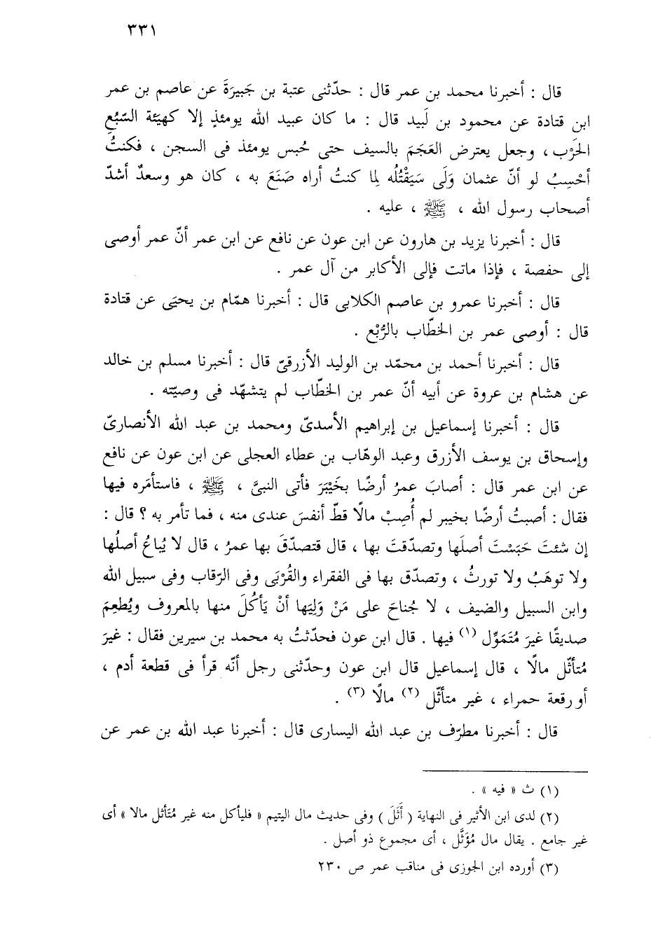 قال: أخبرنا إسماعيل بن إبراهيم الأسدىّ ومحمد بن عبد الله الأنصارىّ وإسحاق بن يوسف الأزرق وعبد الوهّاب بن عطاء العجلى عن ابن عون عن نافع عن ابن عمر قال: أصابَ عمرُ أرضًا بخَيْبَرَ فأتى النبىَّ، -صلى الله عليه وسلم-، فاستأمَره فيها فقال: أصبتُ أرضًا بخيبر لم أُصِبْ مالًا قطّ أنفسَ عندى منه، فما تأمر به؟ قال: إن شئتَ حَبَسْتَ أصلَها وتصدّقتَ بها، قال قتصدّقَ بها عمرُ، قال لا يُباعُ أصلُها ولا توهَبُ ولا تورثُ، وتصدّق بها في الفقراء والقُرْبَى وفى الرّقاب وفى سبيل الله وابن السبيل والضيف، لا جُناحَ على مَنْ وَلِيَها أنْ يَأكُلَ منها بالمعروف ويُطعِمَ صديقًا غيرَ مُتَمَوِّل (¬١) فيها. قال ابن عون فحدّثتُ به محمد بن سيرين فقال: غيرَ مُتأثّل مالًا، قال إسماعيل قال ابن عون وحدّثنى رجل أنّه قرأ في قطعة أدم، أو رقعة حمراء، غير متأثّل (¬٢) مالًا (¬٣).