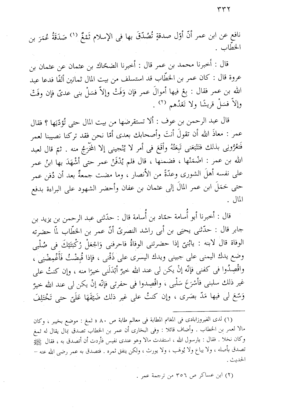 نافع عن ابن عمر أنّ أوّل صدقةٍ تُصُدّقَ بها في الإسلام ثَمْغٌ (¬١) صَدَقَةُ عُمَرَ بن الخطّاب.