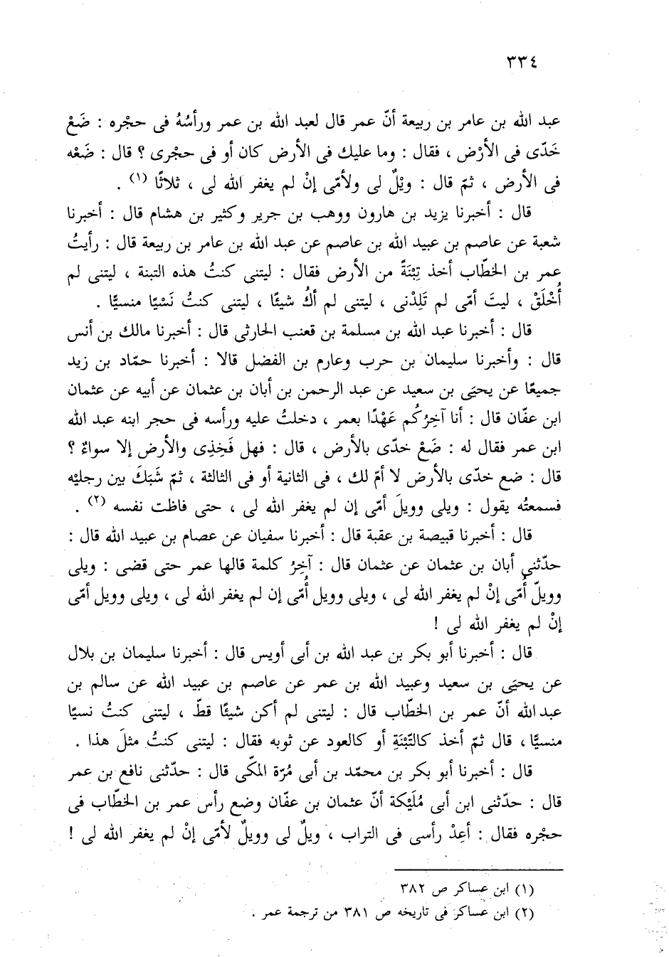 قال: أخبرنا يزيد بن هارون ووهب بن جرير وكثير بن هشام قال: أخبرنا شعبة عن عاصم بن عبيد الله بن عاصم عن عبد الله بن عامر بن ربيعة قال: رأيتُ عمر بن الخطّاب أخذ تِبْنَةً من الأرض فقال: ليتنى كنتُ هذه التبنة، ليتنى لم أُخْلَقْ، ليتَ أُمِّى لم تَلِدْنى، ليتنى لم أكُ شيئًا، ليتنى كنتُ نَسْيًا منسيًّا.