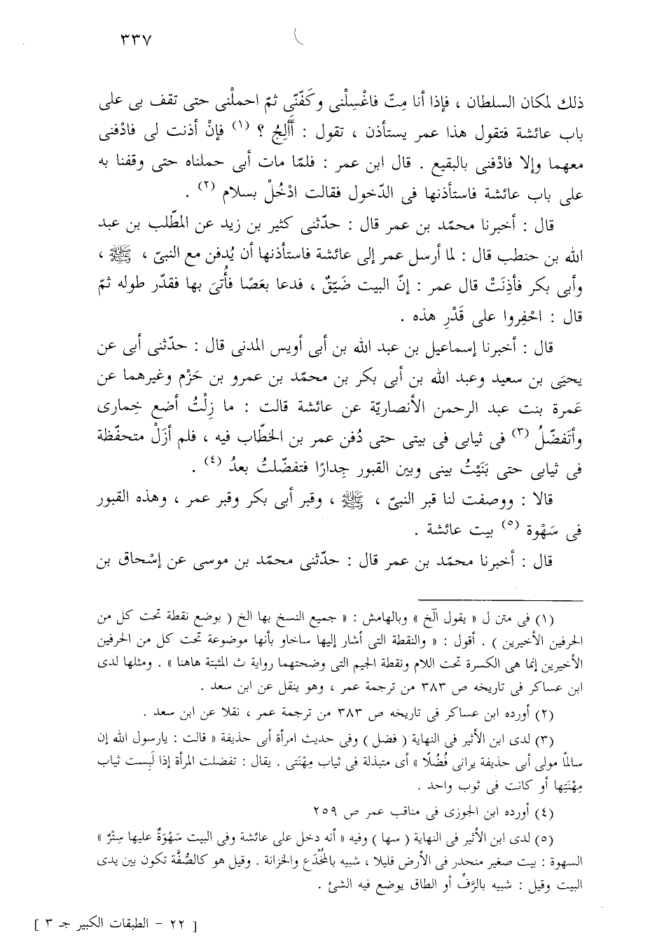 قال: أخبرنا إسماعيل بن عبد الله بن أبى أويس المدنى قال: حدّثنى أبى عن يحيَى بن سعيد وعبد الله بن أبى بكر بن محمّد بن عمرو بن حَزْم وغيرهما عن عَمرة بنت عبد الرحمن الأنصاريّة عن عائشة قالت: ما زِلْتُ أضع خِمارى وأتَفضّلُ (¬٣) في ثيابى في بيتى حتّى دُفن عمر بن الخطّاب فيه، فلم أزَلْ متحفّظة في ثيابى حتّى بَنَيْتُ بينى وبين القبور جِدارًا فتفضّلتُ بعدُ (¬٤).